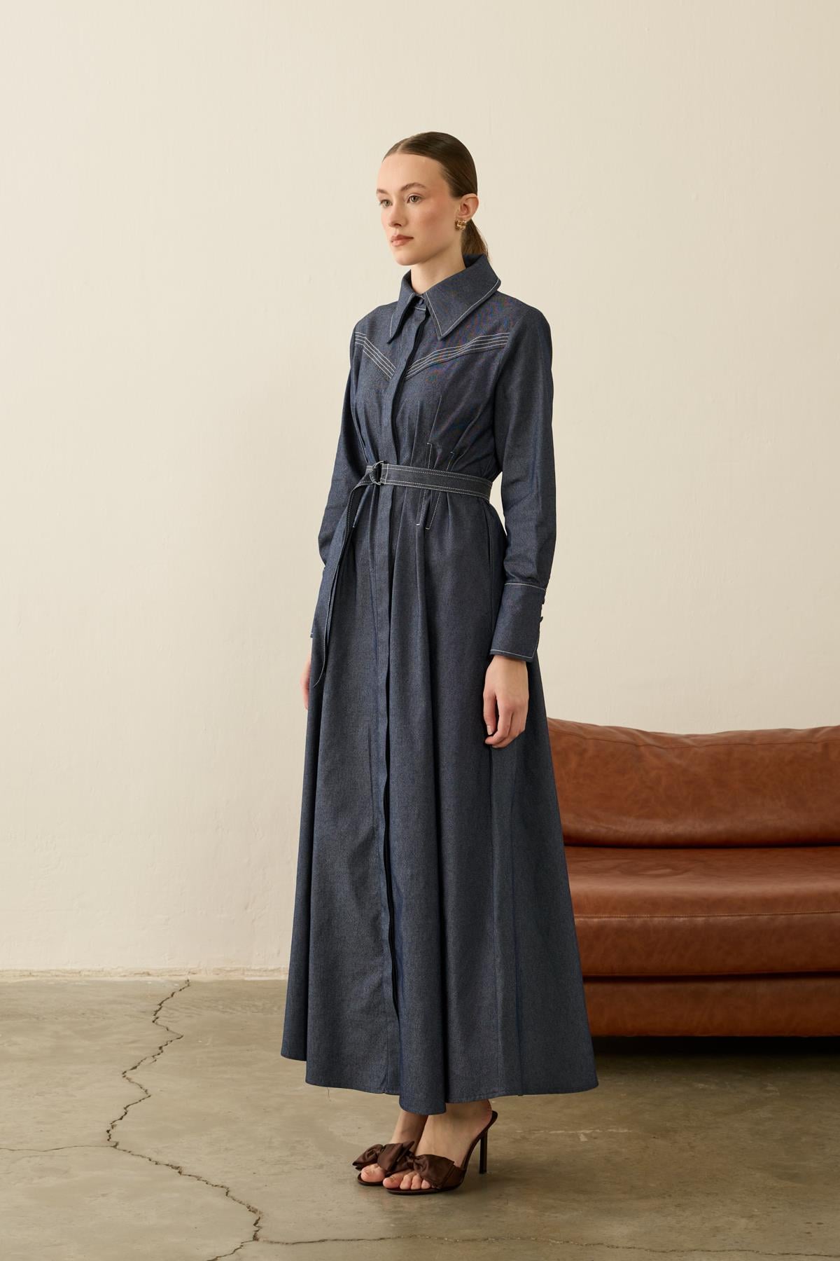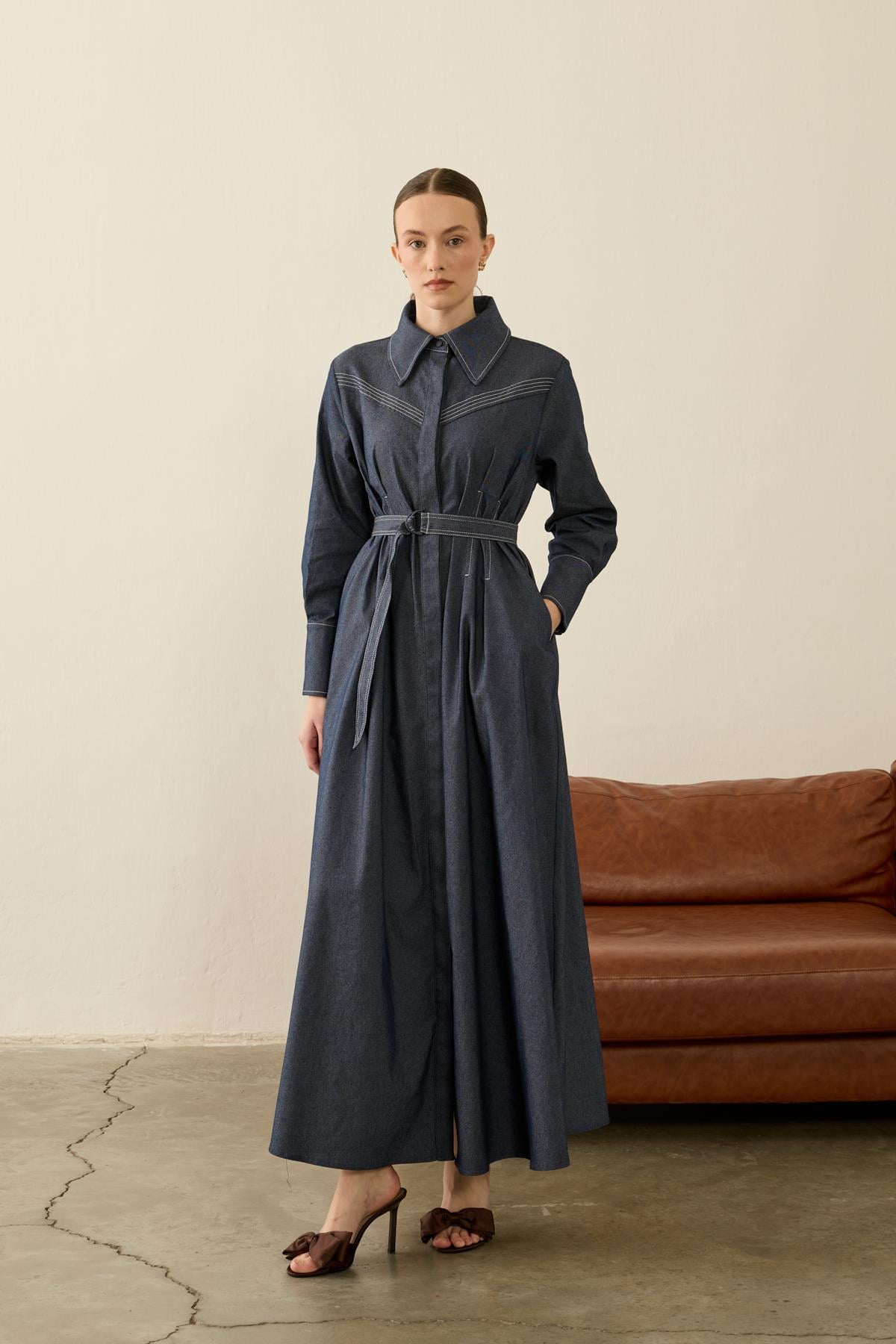 فستان ليندا بتفاصيل درزات متباينة باللون الأزرق الداكن
