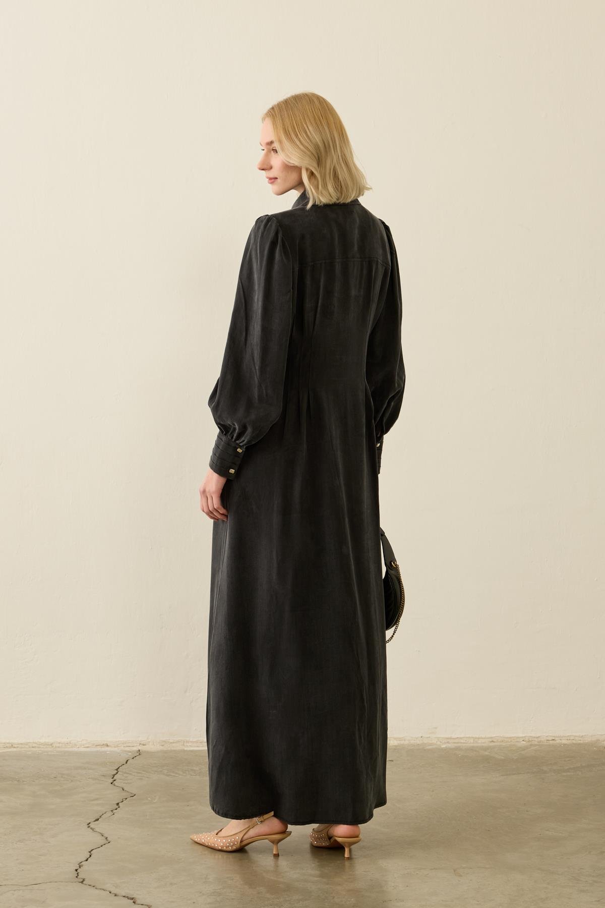 فستان ماري من الليوسيل مع تركيب عند الخصر باللون الأسود