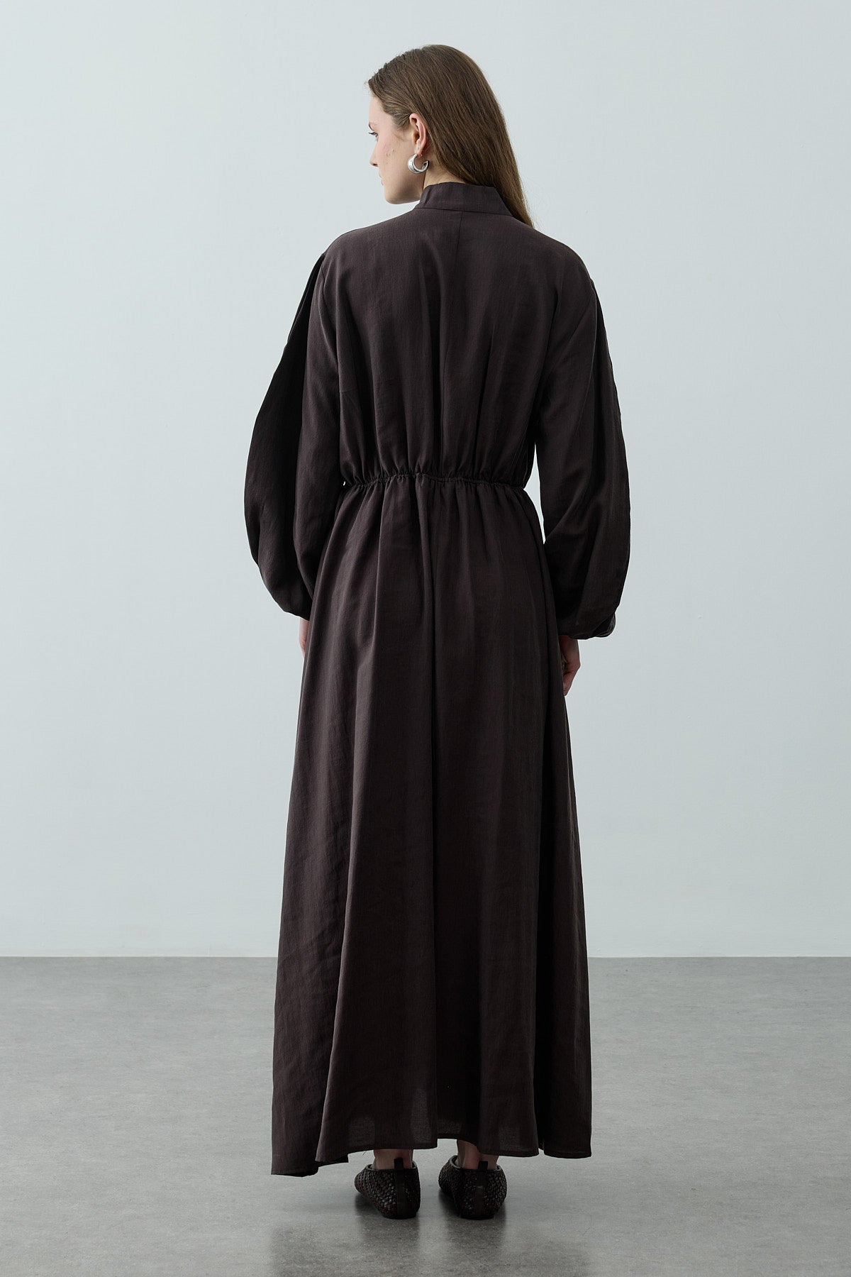 فستان ماكسي مصنوع من قماش منسوج أنيق، بخط عنق ذي طوق، وإغلاق بأزرار أمامية، وإكسسوارات أمامية قابلة للإزالة، وأكمام بالون طويلة.