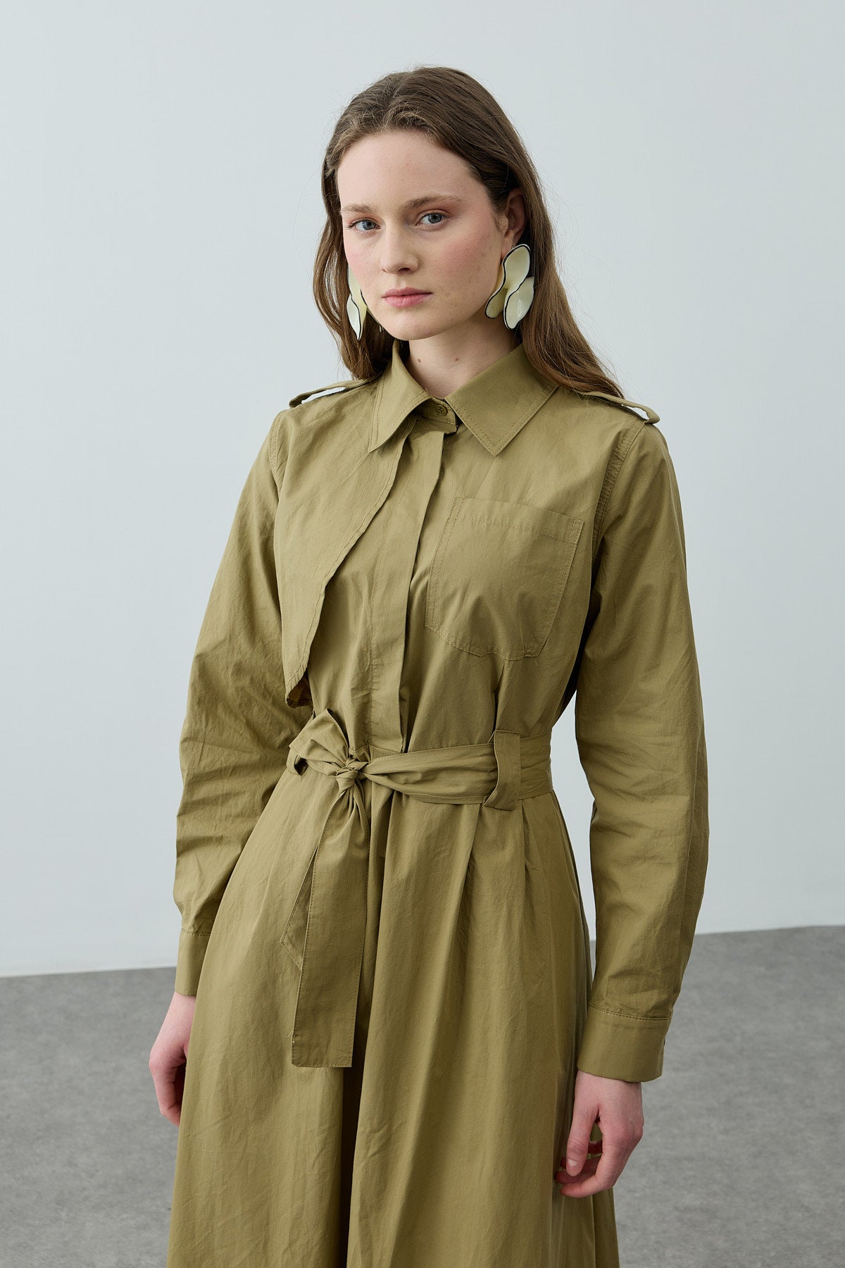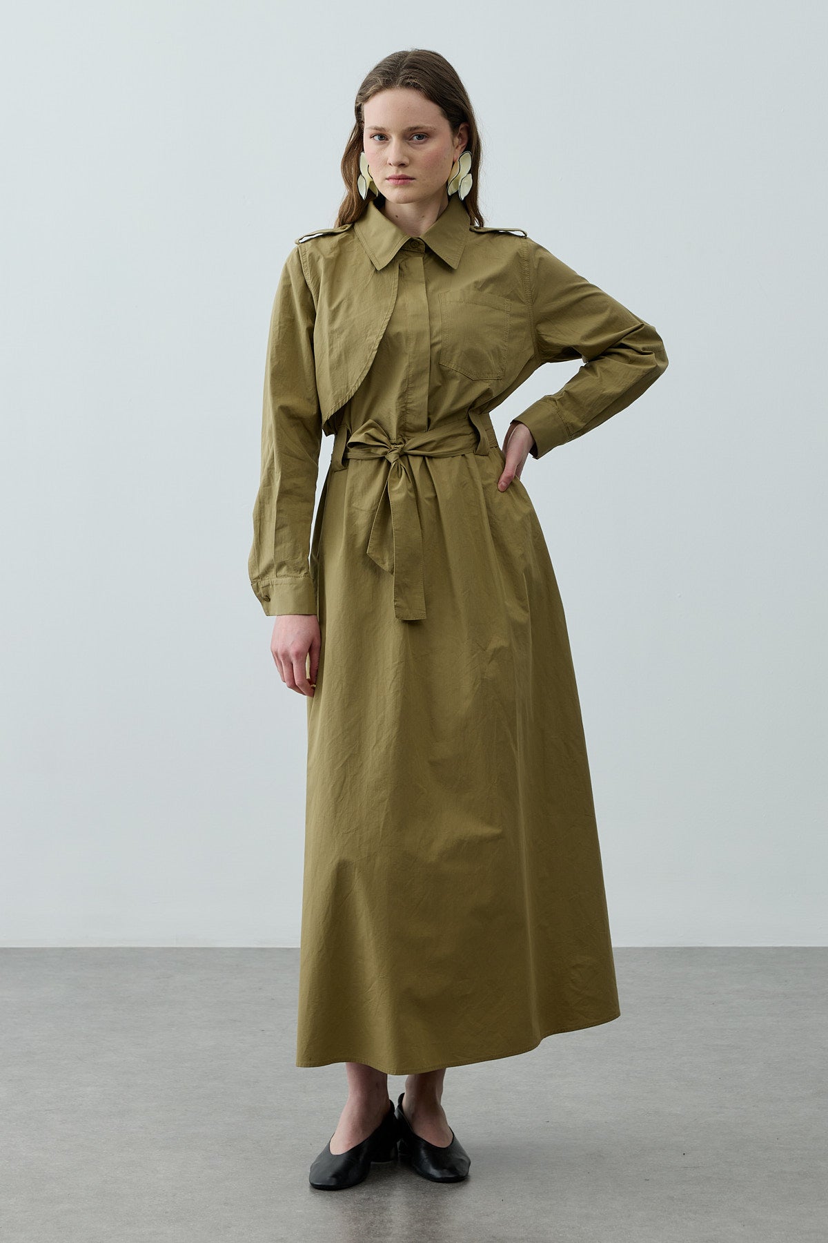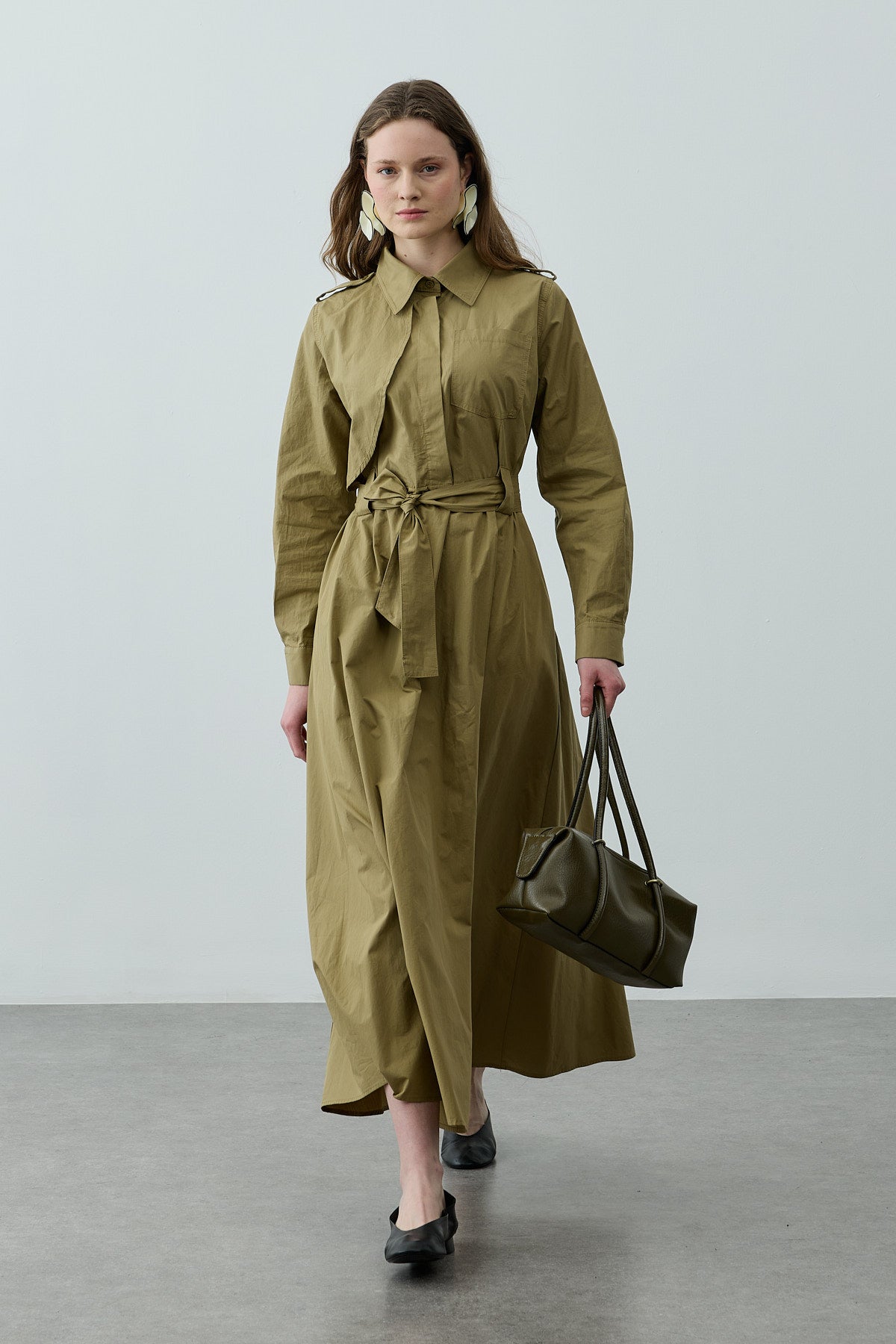 مصنوع من قماش منسوج بنسبة 100% قطن، يتميز بقلب قميصي، وفتحة أمامية، وإغلاق بأزرار، وأكمام طويلة مع أصفاد، وتفاصيل واقي رياح أمامي، وتصميم ذو جاكيت، وحزام، وطول ماكسي.