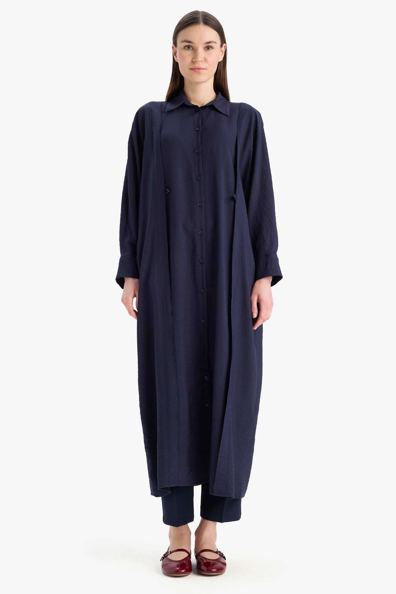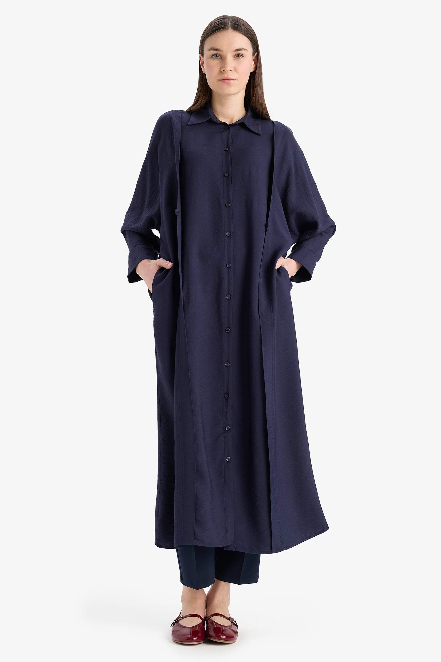 التفاصيل: خصر مع حزام، تفاصيل مطوية في المقدمة، أكمام طويلة مع كفة