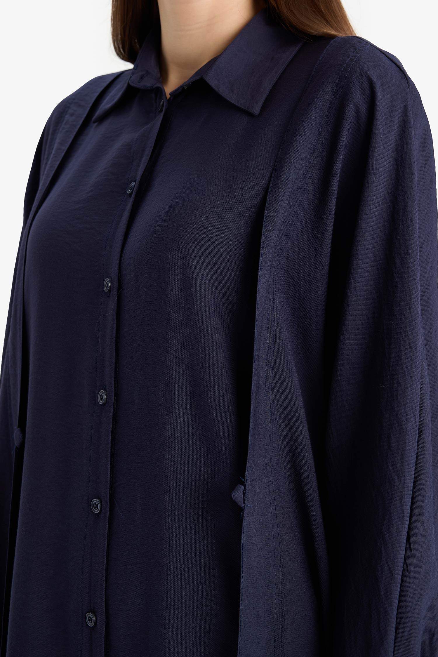 فستان باللون الأزرق الداكن مصمم للاستخدام اليومي للنساء البالغات. يتميز بقصة مريحة وتصميم بأكمام طويلة مما يجعله مميزًا. مناسب لموسم الربيع/الصيف، يقدم مظهرًا أنيقًا مع تفاصيل الكتف المنخفضة. خيار مثالي لإكمال أناقتك مع تفاصيل طوق القميص.