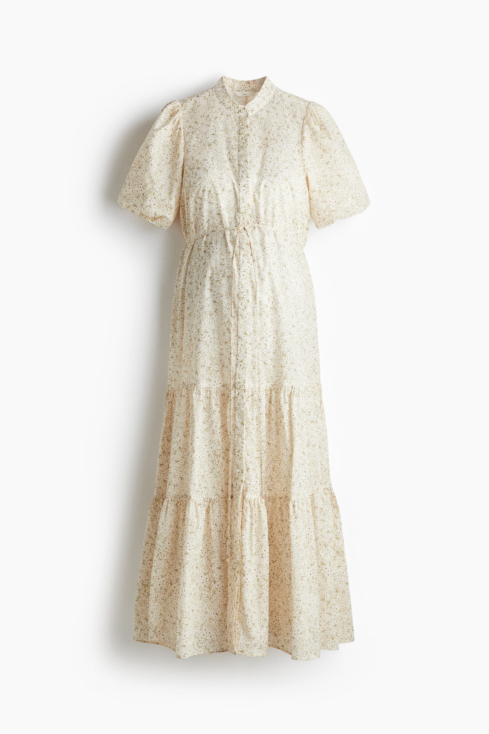 فستان بطول الرسغ مصنوع من قماش قطني منسوج، يتميز بقلادة على شكل شريط وأزرار أمامية مخفية. بتصميم أكمام بالون قصيرة، وحزام رفيع قابل للإزالة تحت الصدر، وتنورة مفتوحة، وطيات مطوية لإضافة حجم إضافي.