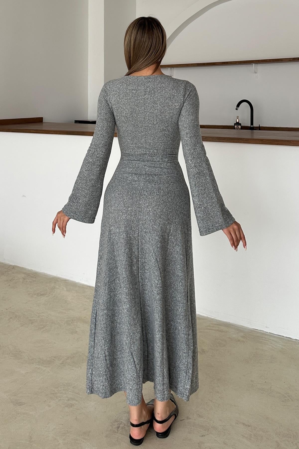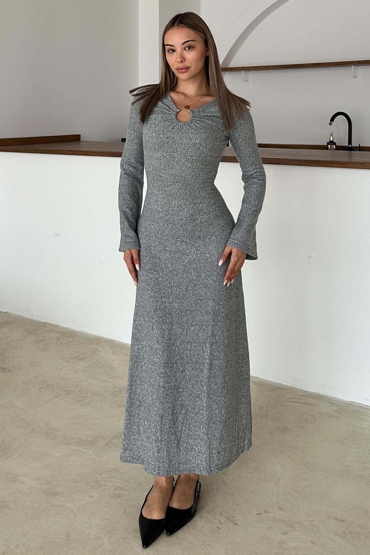 فستان متماسك مزود بإكسسوارات أمامية باللون الرمادي 9367-E
