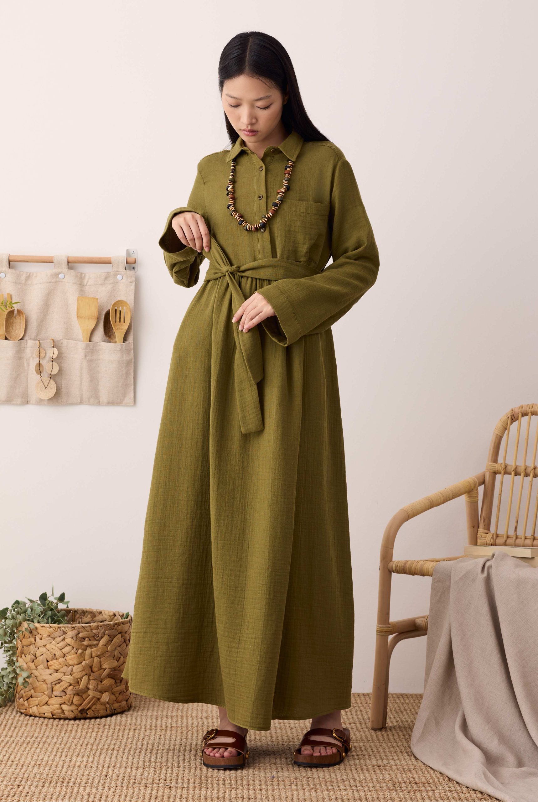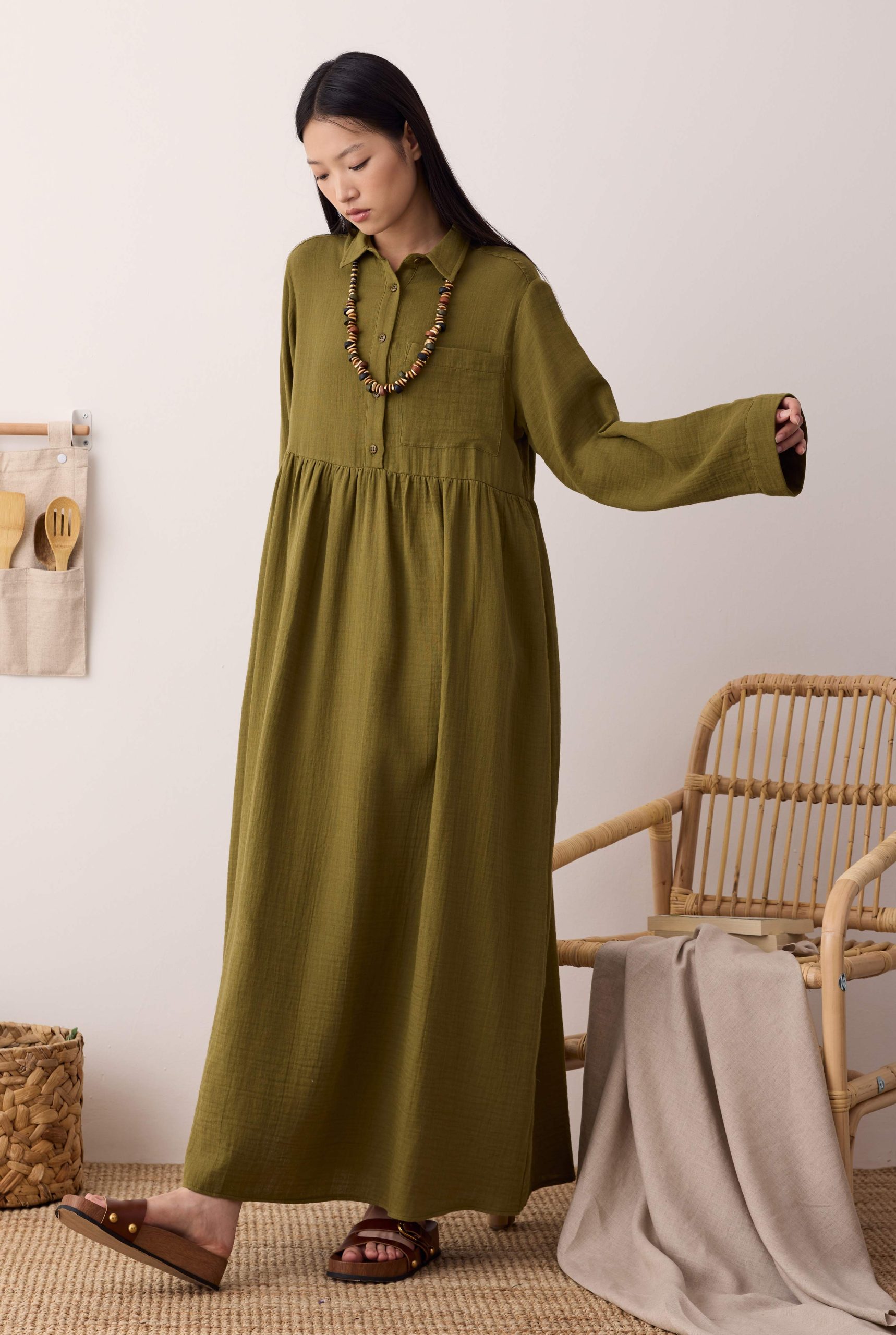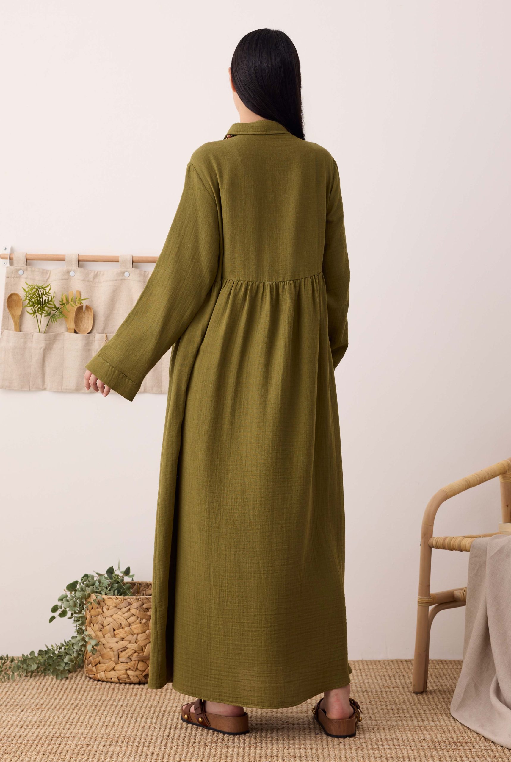 فساتيننا المصنوعة من قماش الشاش القطني 100% تقدم تصميمًا كلاسيكيًا ونسيجًا يتنفس لراحة مطلقة حتى في أشد الأيام حرارة. الألوان الفاتحة تبقى غير ظاهرة عند ارتدائها مع كاميسول بلون البشرة. أقمشة الشاش الخاصة المعدة بألوان تتوافق مع ألوان بانتن 2025 يمكن استخدامها لسنوات كما لو كانت جديدة عند غسلها برفق على 30°م. المنتج ذو قصة واسعة؛ إذا كنتِ تفضلين مظهرًا أقل اتساعًا من الظاهر على العارضة، يمكنكِ اختيار مقاس أصغر. الطول: 138 سم (قد يختلف طول المنتج 1-5 سم بين القطع). معلومات القالب: الصدر الكم طول الذراع المقاس 36: 102 سم 38 سم 59 سم المقاس 38: 106 سم 40 سم 60 سم المقاس 40: 110 سم 42 سم 61 سم المقاس 42: 114 سم 44 سم 62 سم مقاسات العارضة: الطول: 176 سم الصدر: 80 سم الخصر: 61 سم الأرداف: 90 سم المقاس الذي ترتديه العارضة: 36