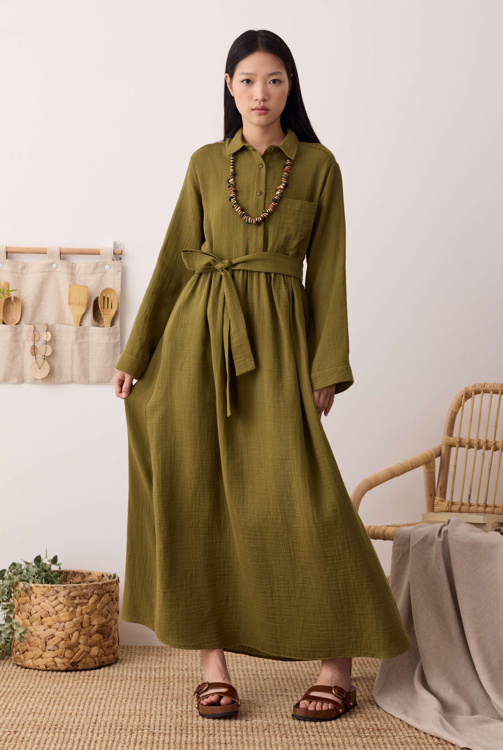 فستان مخصر بتجمعات من الشاش بلون الزيتوني