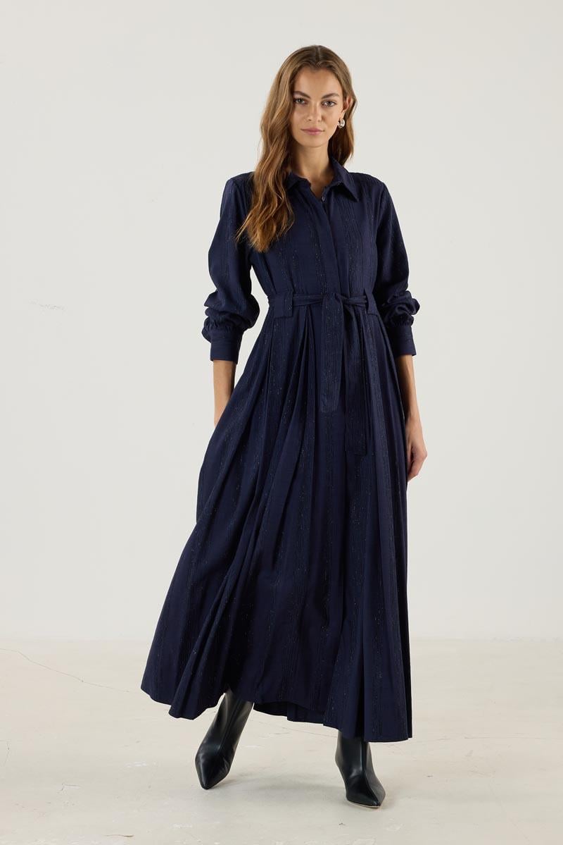 فستان مخطط باللون الأزرق الداكن بتفاصيل جسرية