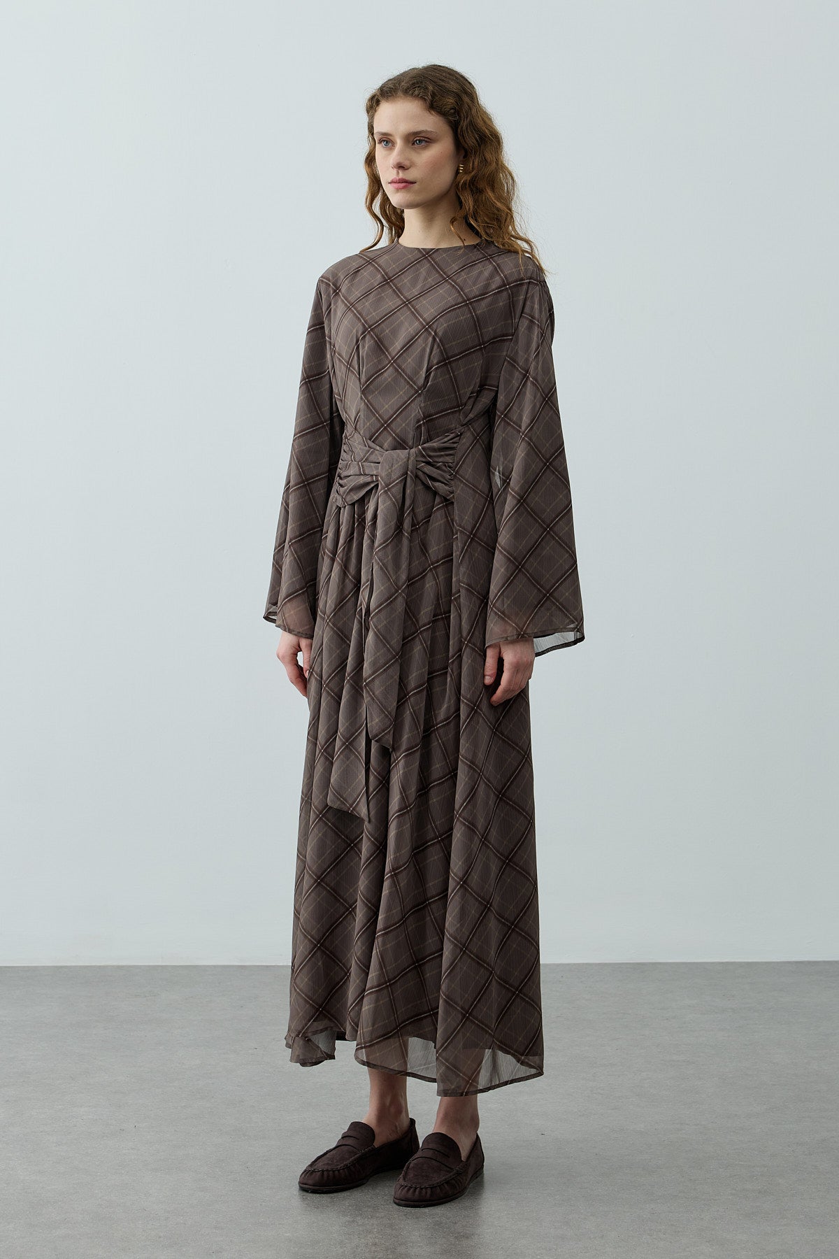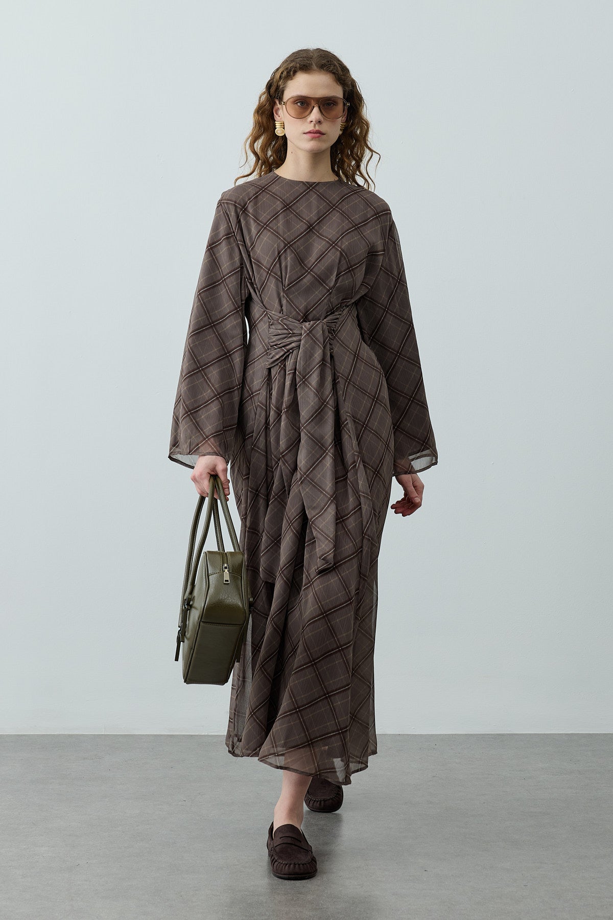 فستان طويل مصنوع من قماش الشيفون مع بطانة قطنية 100٪. يتميز بأكمام طويلة وعريضة، وتفصيل ربط أمامي، وإغلاق بسحار خلفي، ونمط مربعات.