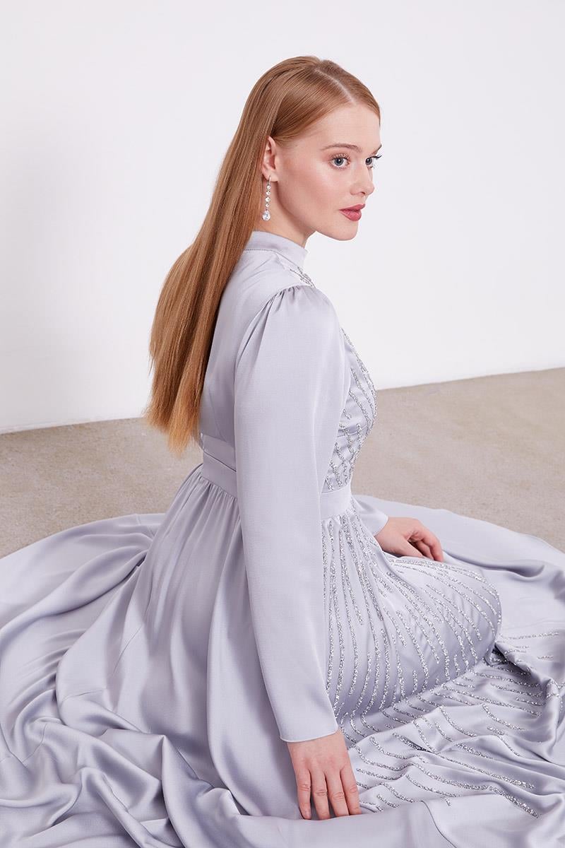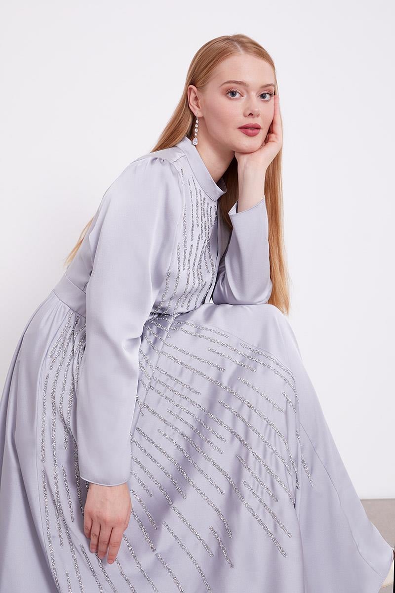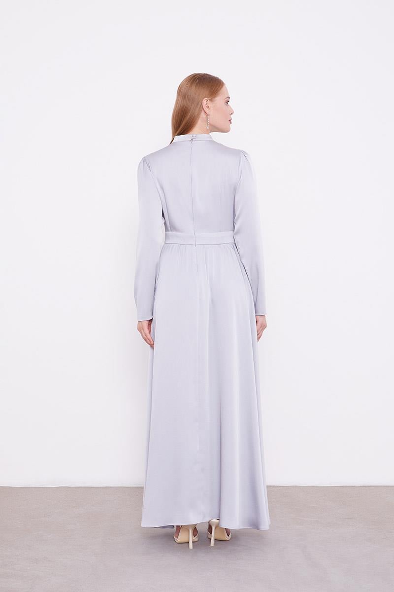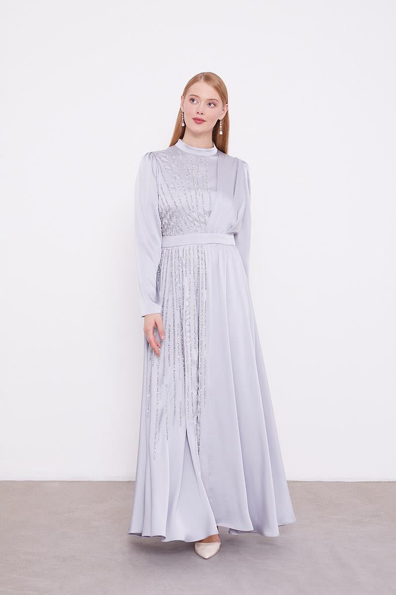 فستان مرصع بالحجارة مع حزام خصر رمادي