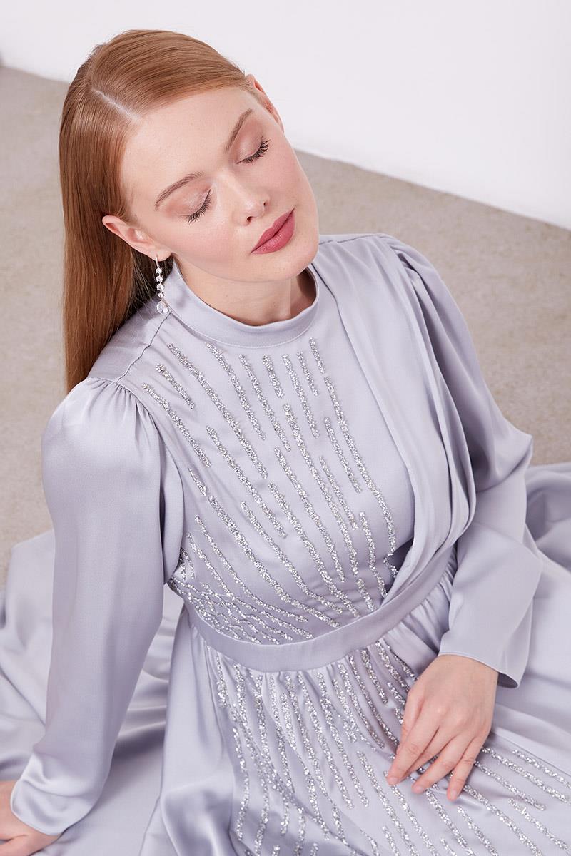 يعرض هذا الفستان الأنيق للمناسبات المسائية هيئة نبيلة بقوام الساتان اللامع، ويعكس الأناقة في أبسط صورها من خلال قصته المكررة وحزامه المزين بتفاصيل اللؤلؤ. خيار مثالي لمن يبحثون عن مظهر راقٍ في الدعوات والمناسبات الخاصة.