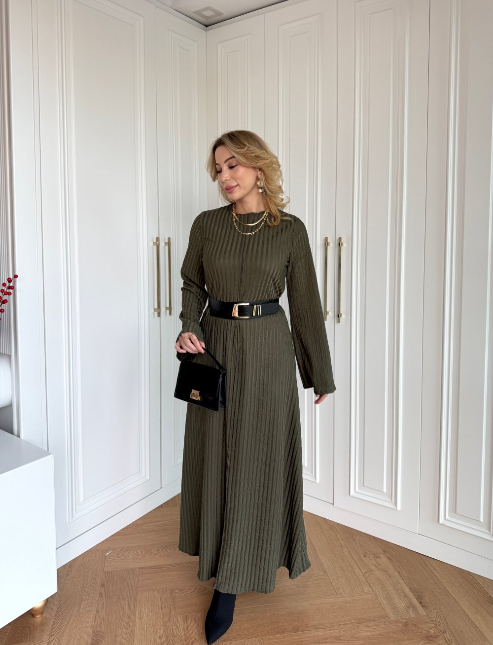يبرز هذا الفستان الطويل بتصميم أنيق وتفاصيل عصرية، حيث يظهر وقفة مثالية بفضل قماش الترينش المتين والمرن في الوقت نفسه. تضيف التفاصيل المطوية في المقدمة حركة للتصميم، بينما يؤكد خط الخصر مع الحزام على منحنيات الجسم بأناقة. بطوله الكامل وتصميمه البسيط، يقدم خياراً أنيقاً للمناسبات الخاصة وللستايل الحضري.