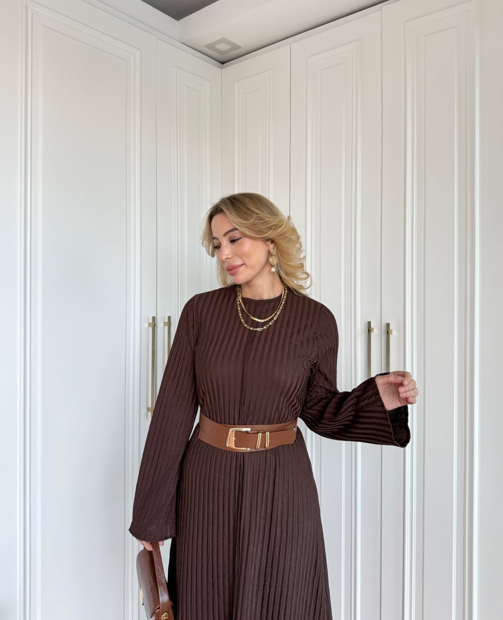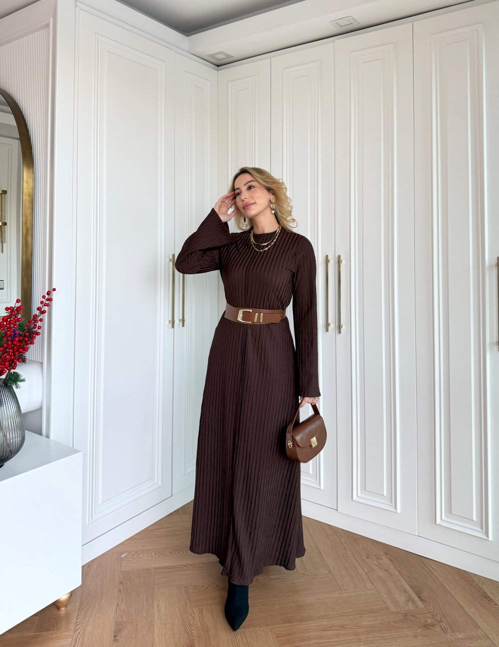 هذا الفستان مصنوع من قماش تريكو محبوك من الدرجة الأولى بتأثير لامع.