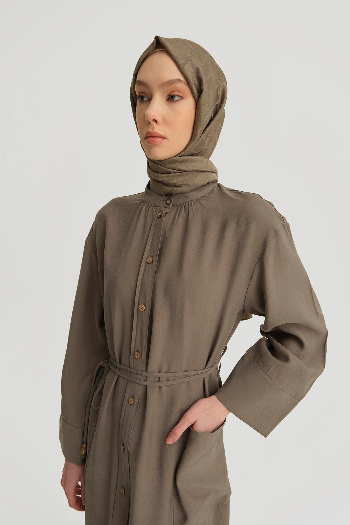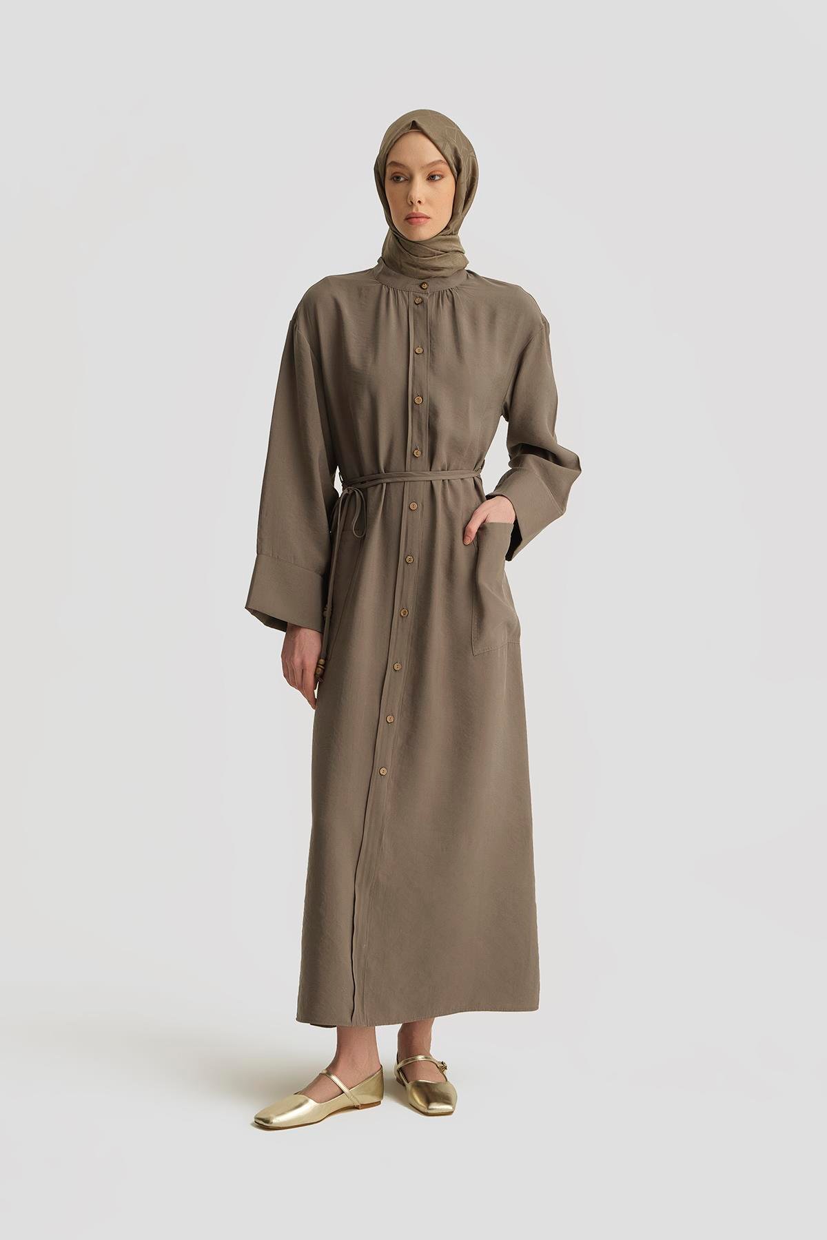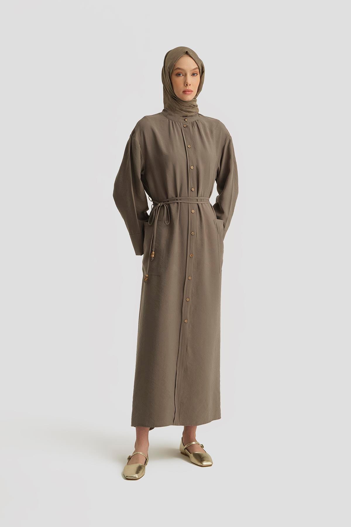 فستان مودال بتفاصيل ربط باللون الخاكي