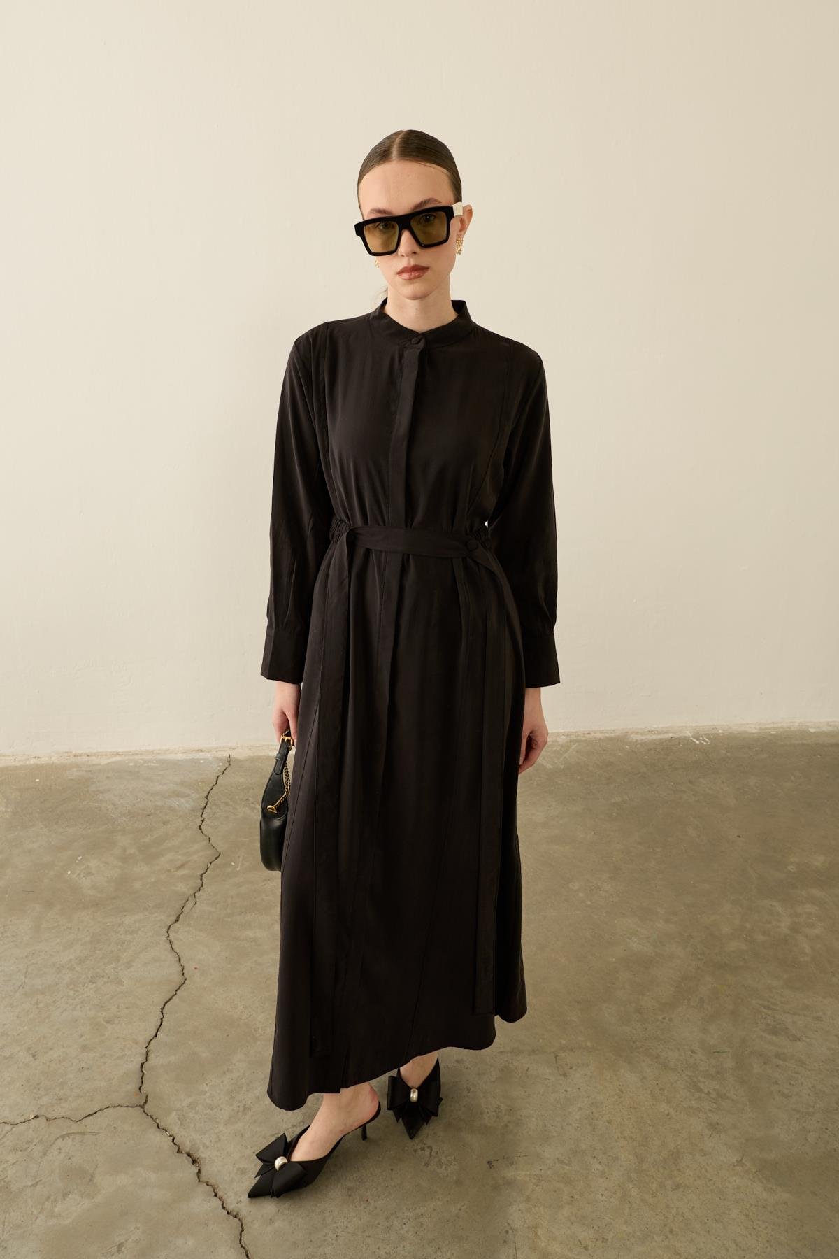 فستان مودال بقبة عالية ورباط مطاطي بالخصر – أسود