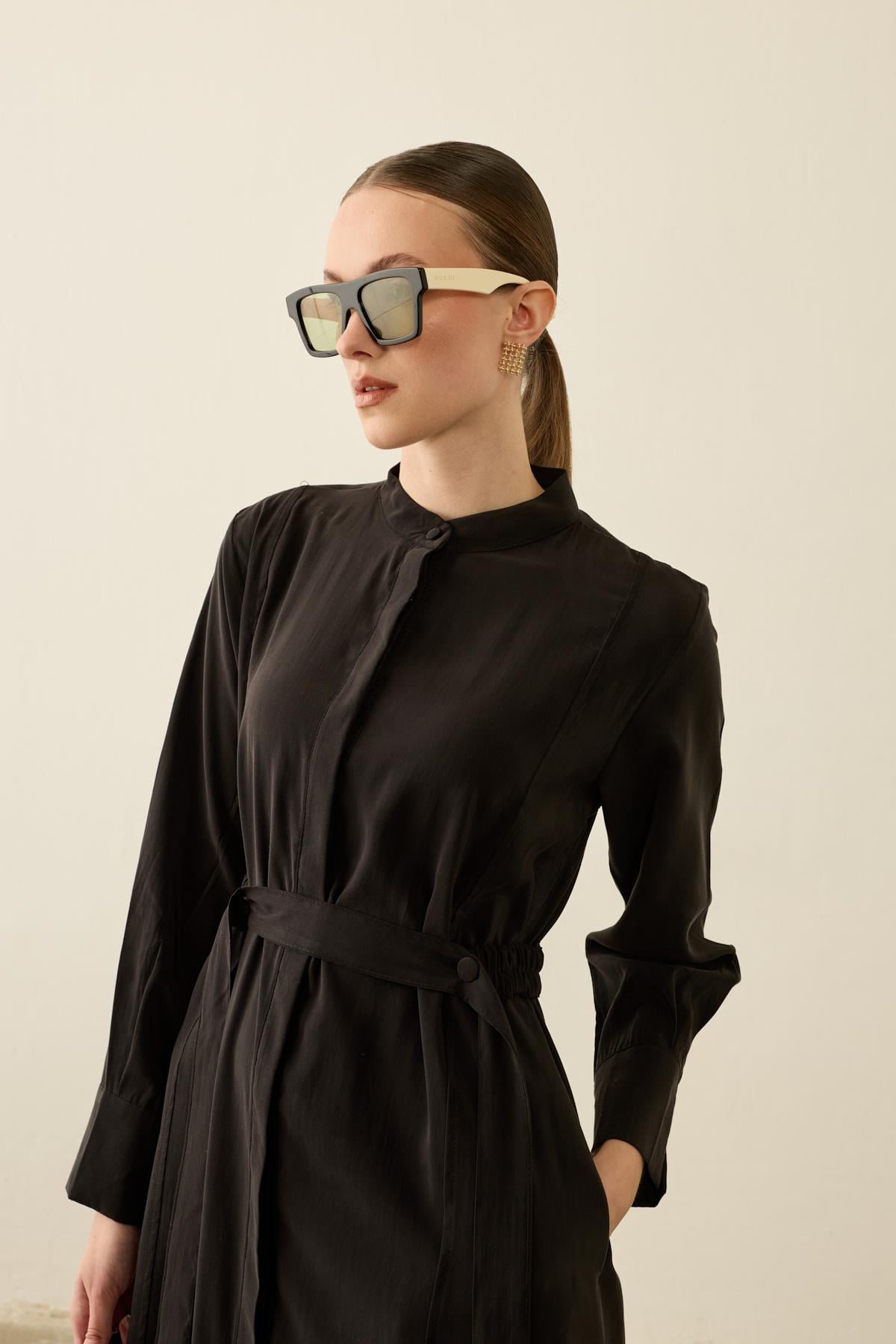 يبرز هذا الفستان الطويل بتصميم أنيق وتفاصيل عصرية، حيث يظهر وقفة مثالية بفضل قماش الترينش المتين والمرن في الوقت نفسه. تضيف التفاصيل المطوية في المقدمة حركة للتصميم، بينما يؤكد خط الخصر مع الحزام على منحنيات الجسم بأناقة. بطوله الكامل وتصميمه البسيط، يقدم خياراً أنيقاً للمناسبات الخاصة وللستايل الحضري.