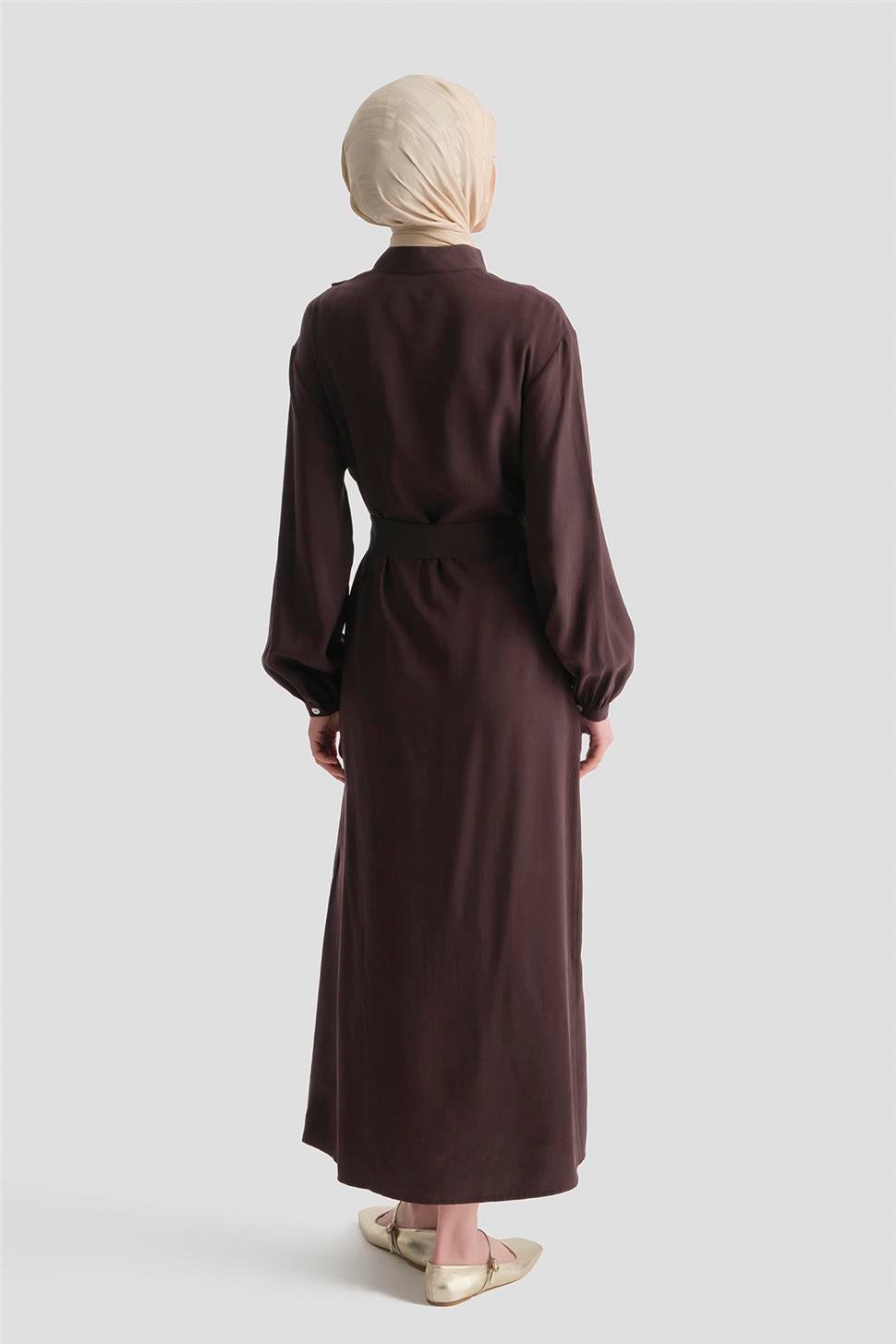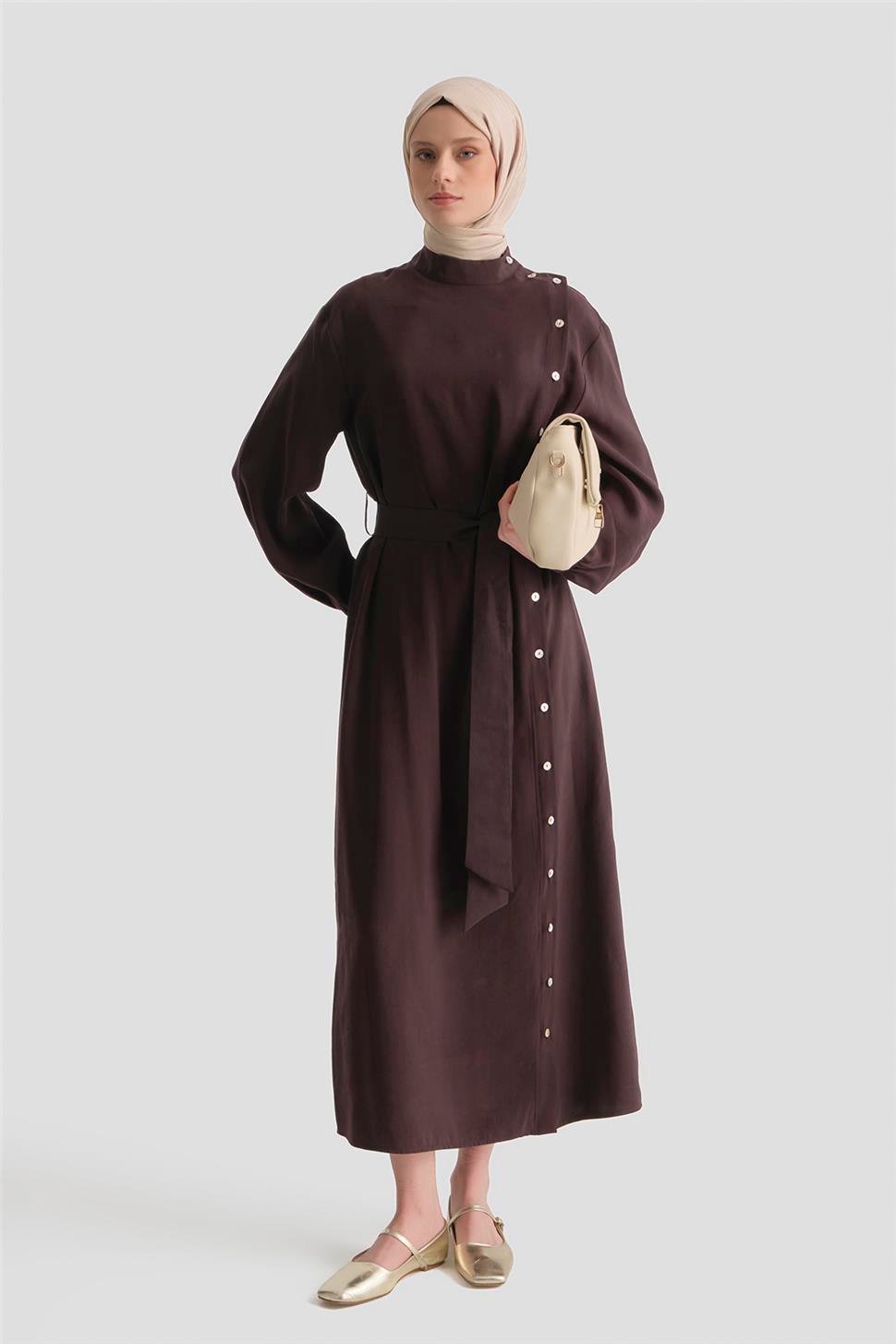 فستان مودال بلون القهوة المرّة مع لمسات من الصدف