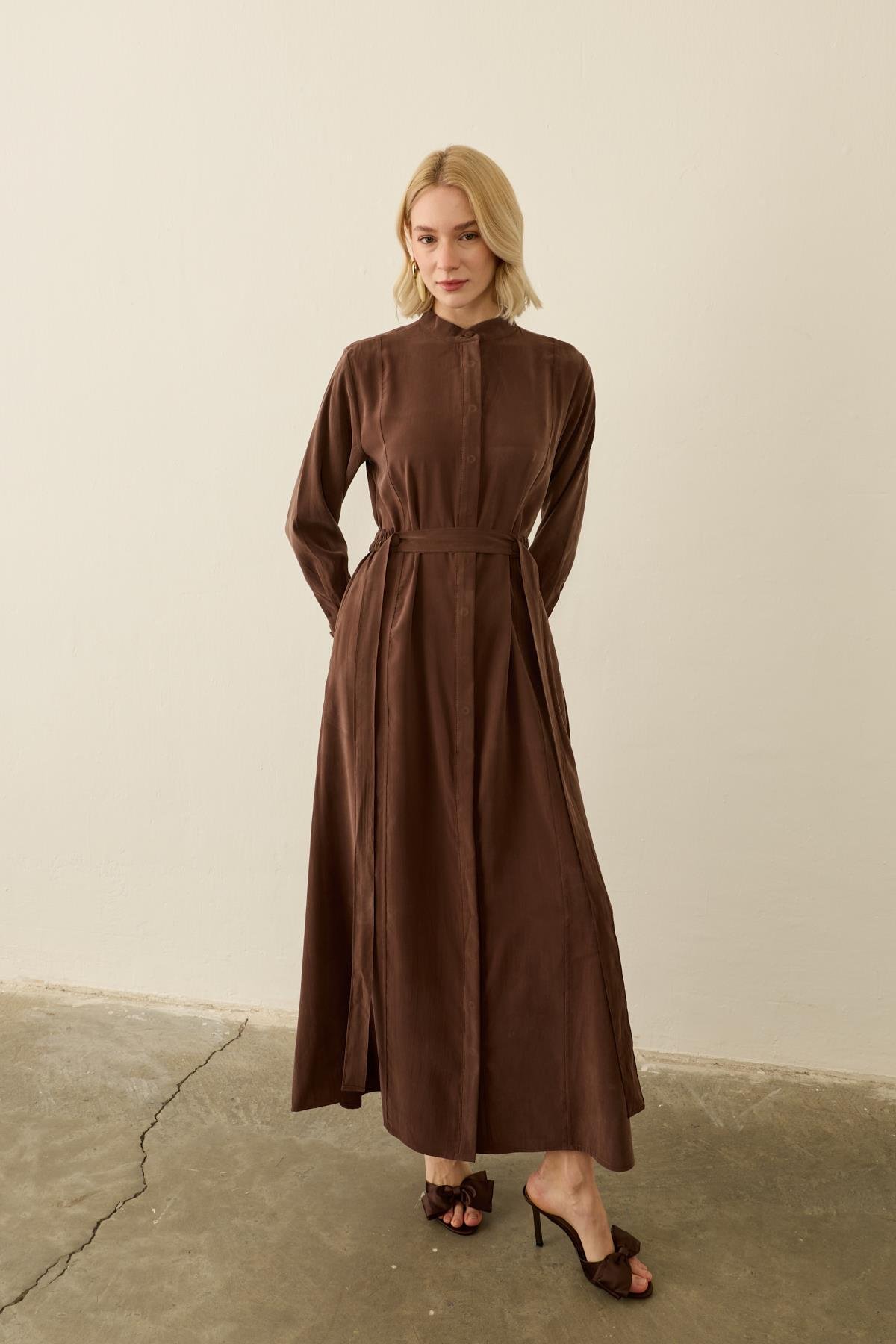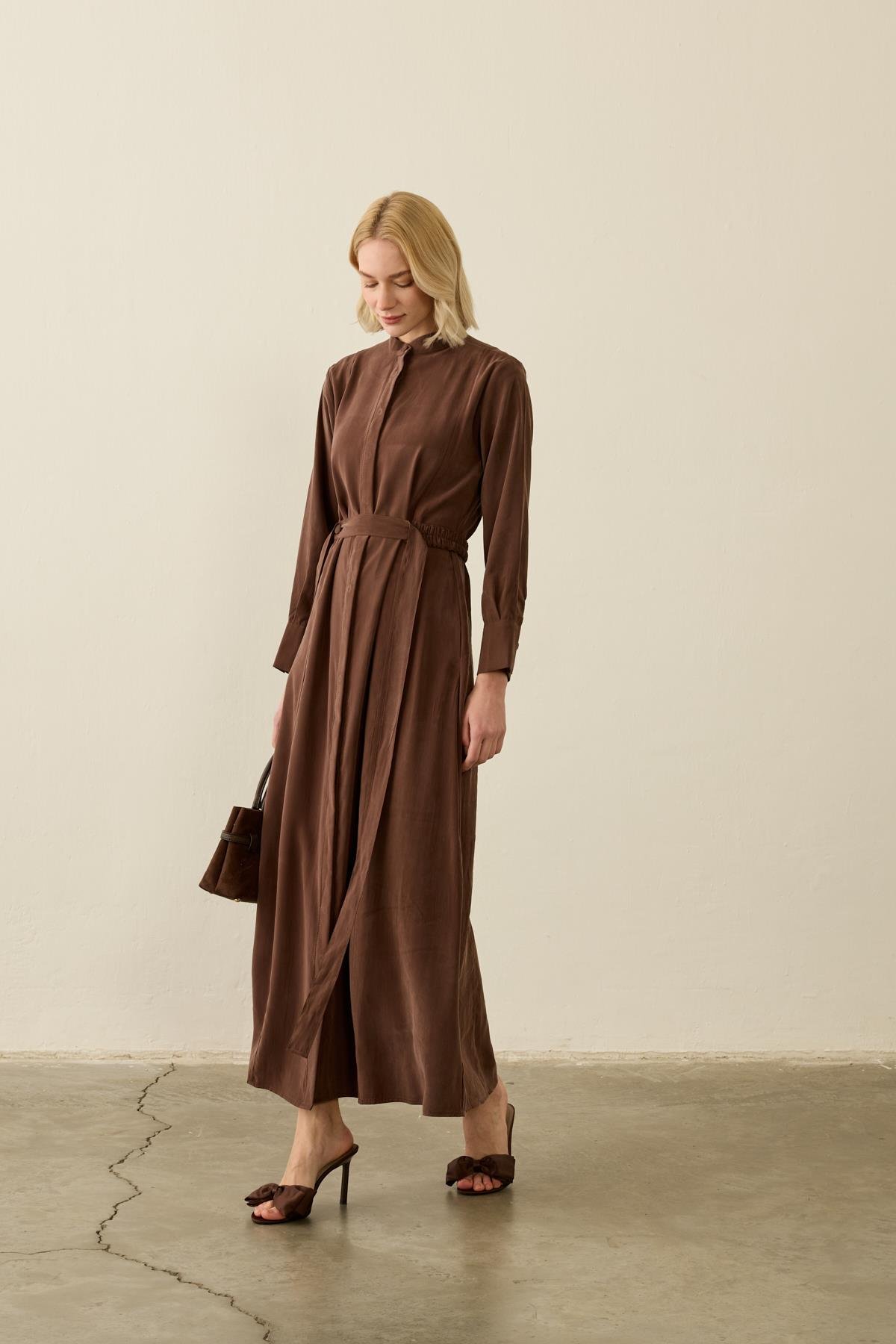 فستان مودال بني مع طوق حاكم وحزام مطاطي