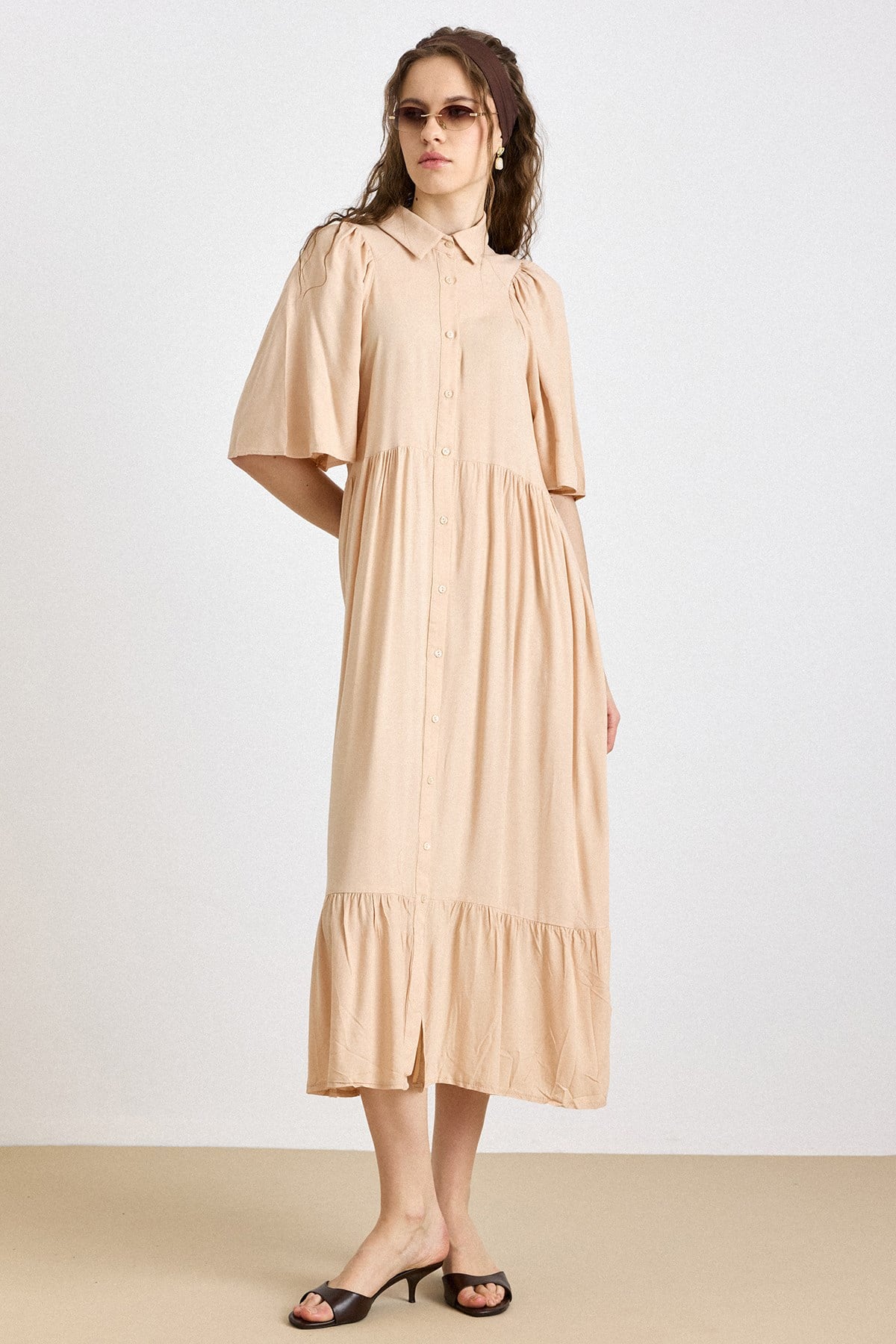 فستان ناعم بنصف كم بتفاصيل تجميعية – لون السلمون 9418-E