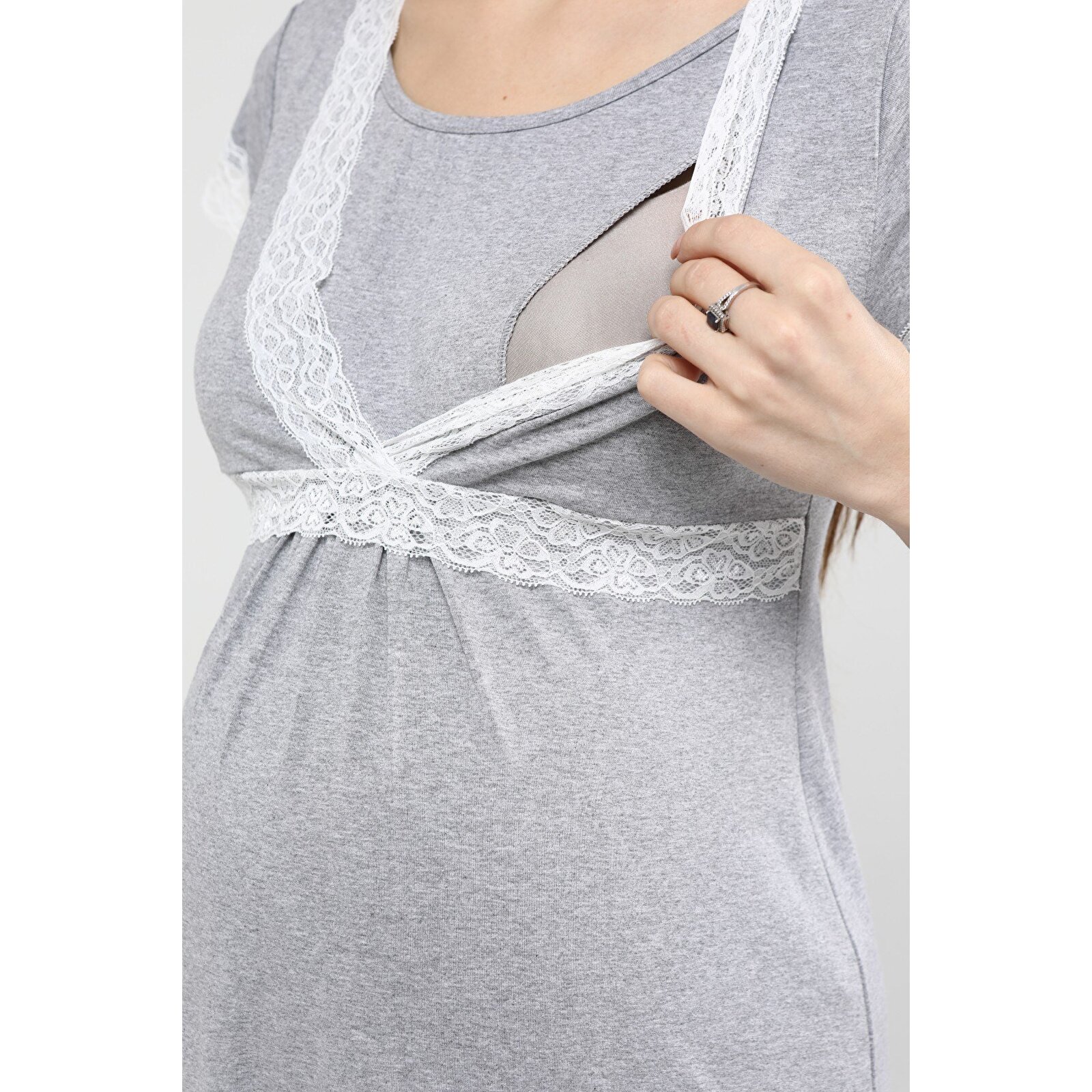العلامات: breastfeeding nightgown, comfortable sleepwear, grey nightgown, lace front slit nightgown, lace nightgown, maternity nightgown, maternity wear, nursing nightgown, postpartum nightgown, women's nightgown