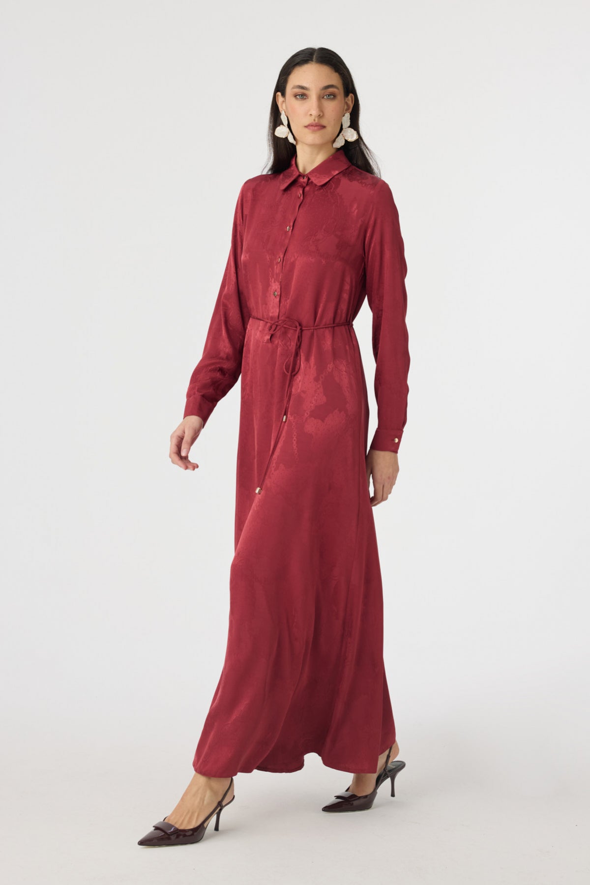 يبرز هذا الفستان الطويل بتصميم أنيق وتفاصيل عصرية، حيث يظهر وقفة مثالية بفضل قماش الترينش المتين والمرن في الوقت نفسه. تضيف التفاصيل المطوية في المقدمة حركة للتصميم، بينما يؤكد خط الخصر مع الحزام على منحنيات الجسم بأناقة. بطوله الكامل وتصميمه البسيط، يقدم خياراً أنيقاً للمناسبات الخاصة وللستايل الحضري.