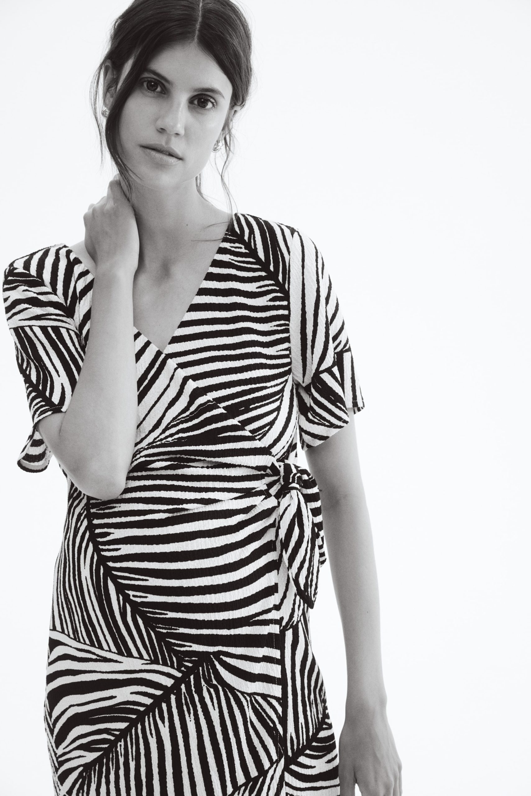 فستان بطول الساق من قماش الجيرسي المكسر، بأكمام قصيرة ورقبة على شكل حرف V، مع تصميم ملفوف في المقدمة بأربطة من جهة وزر مخفي من الجهة الأخرى. مبطّ جزئياً.