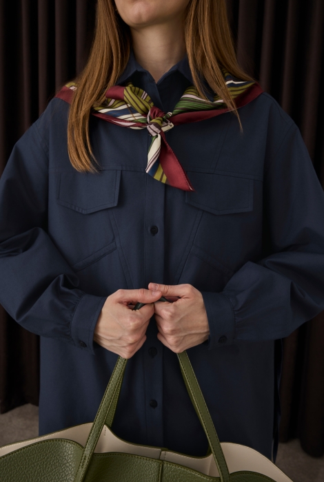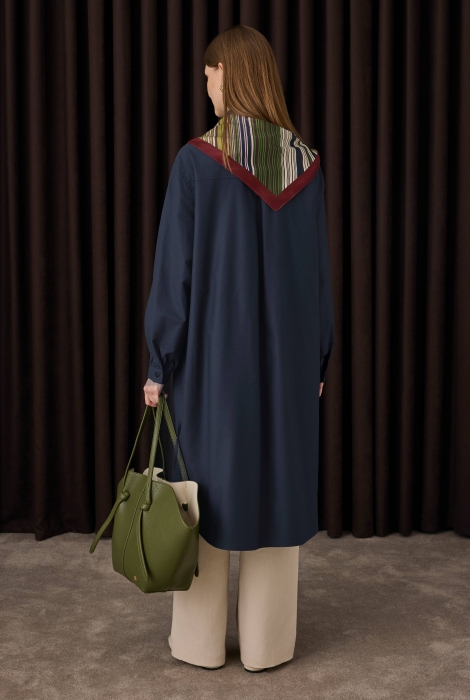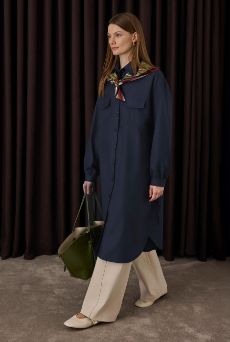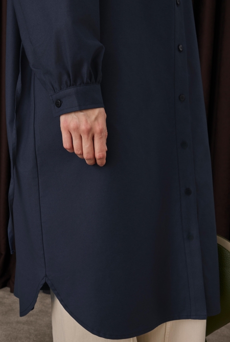 قميص أزرق بحري داكن بتفاصيل تجعيدات طويلة