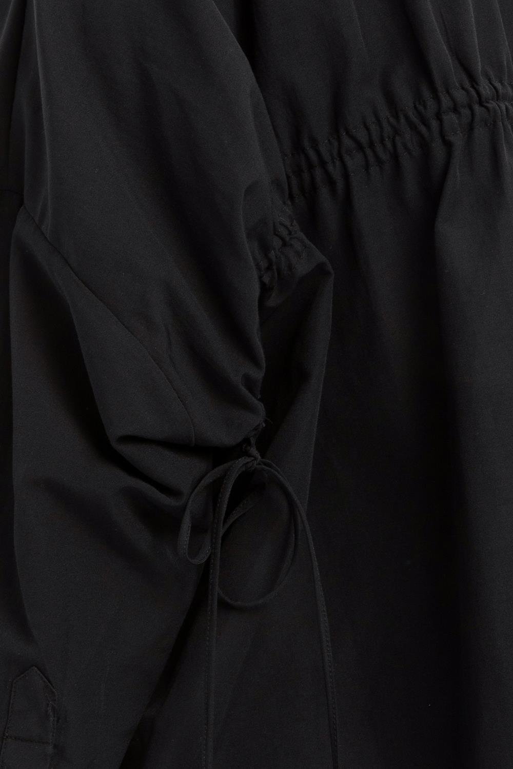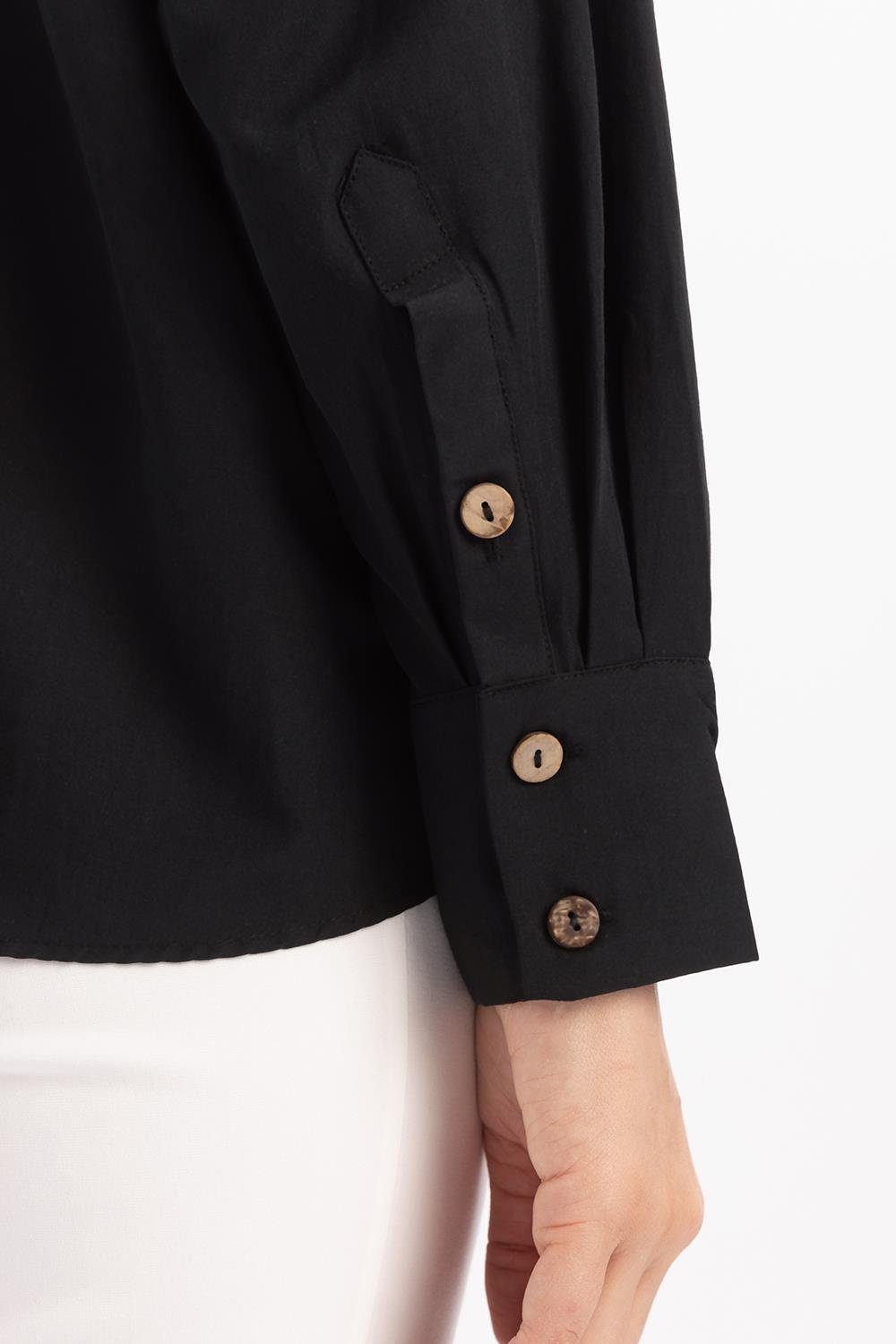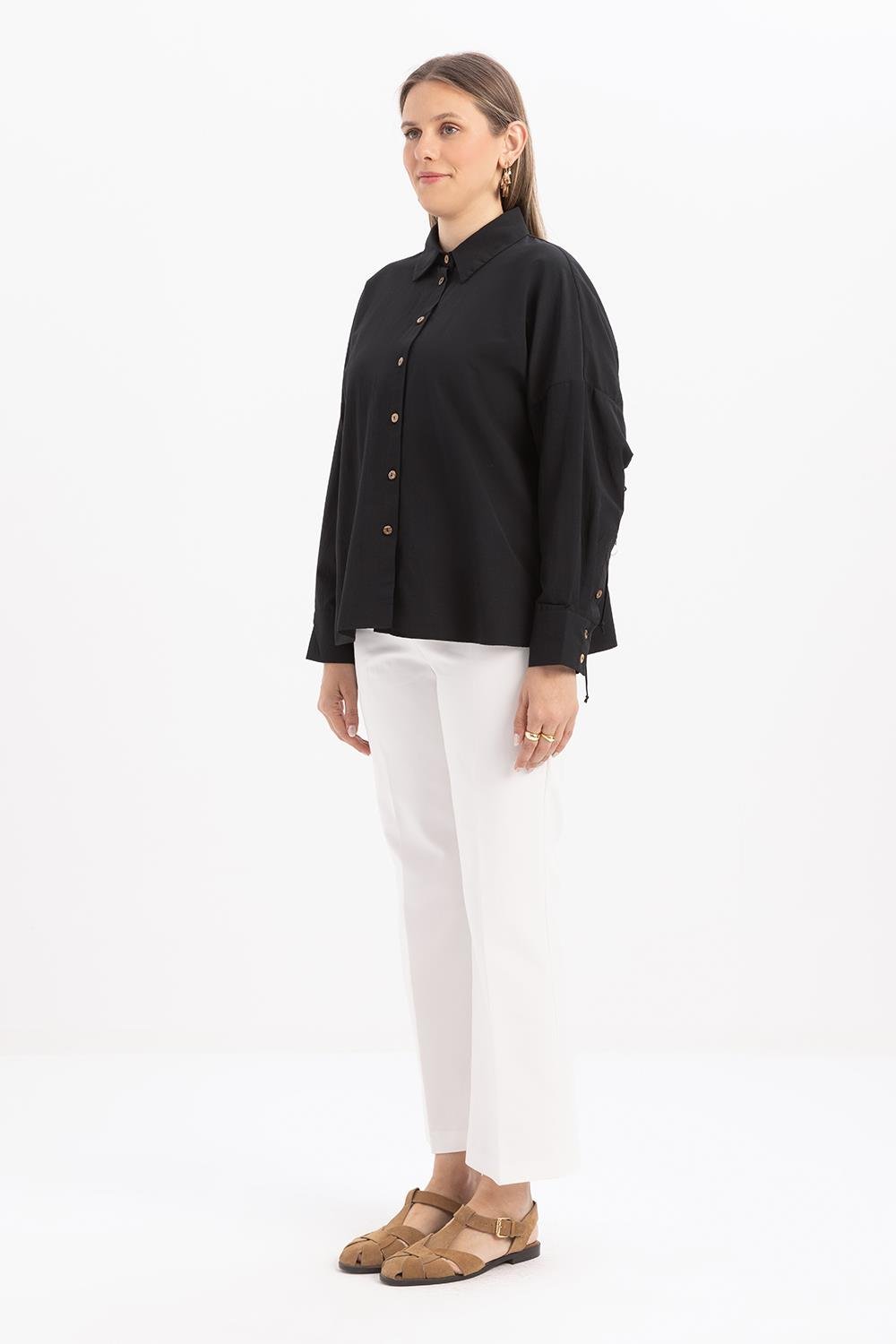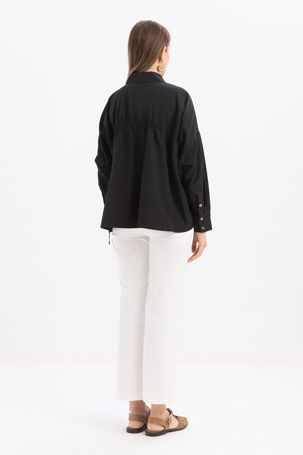 قميص أسود بتفاصيل مجمعة من الخلف