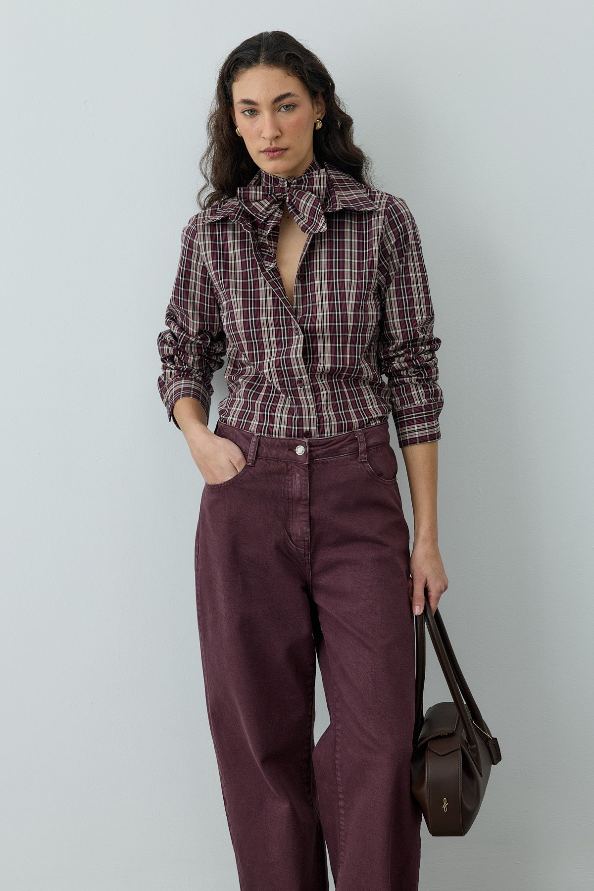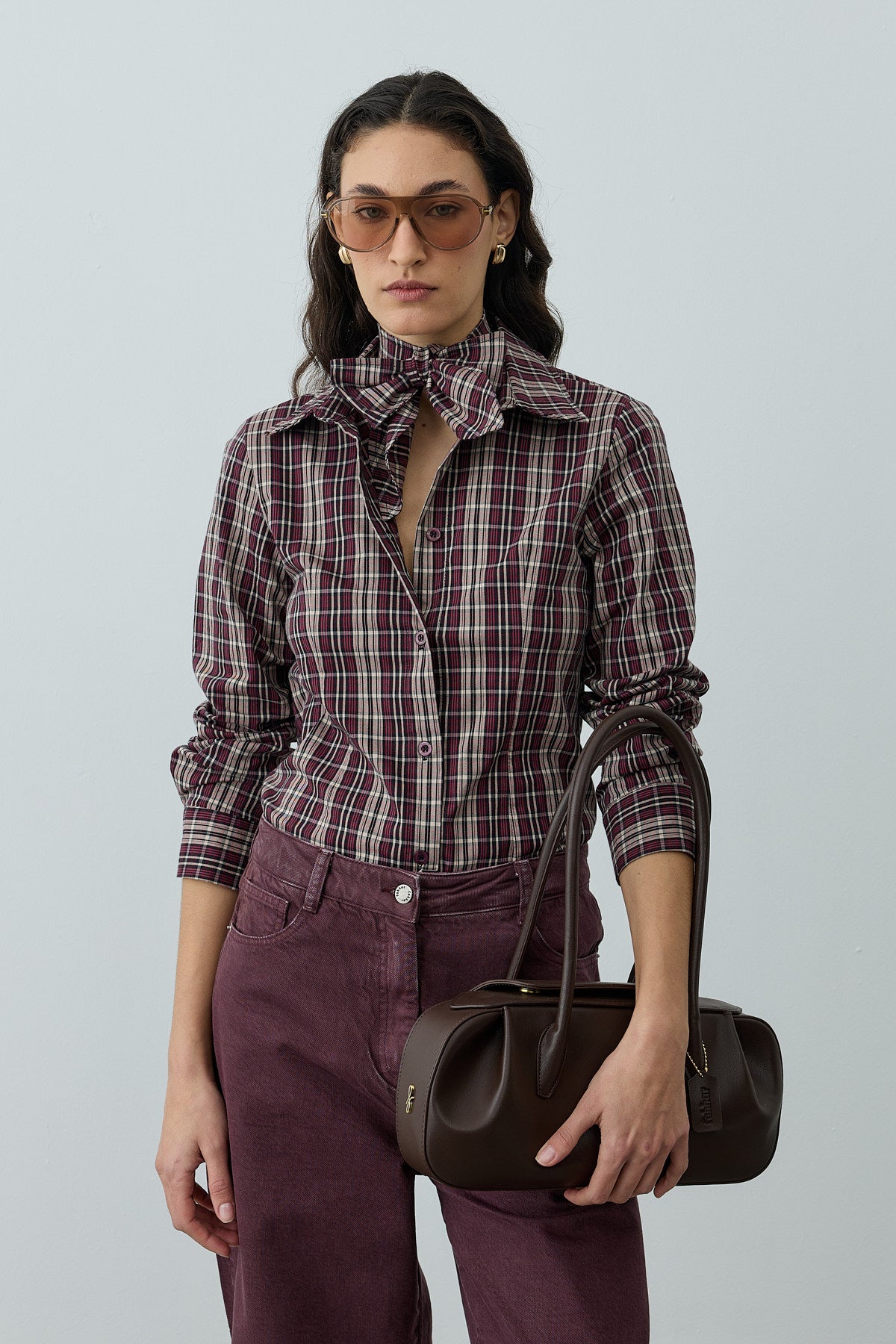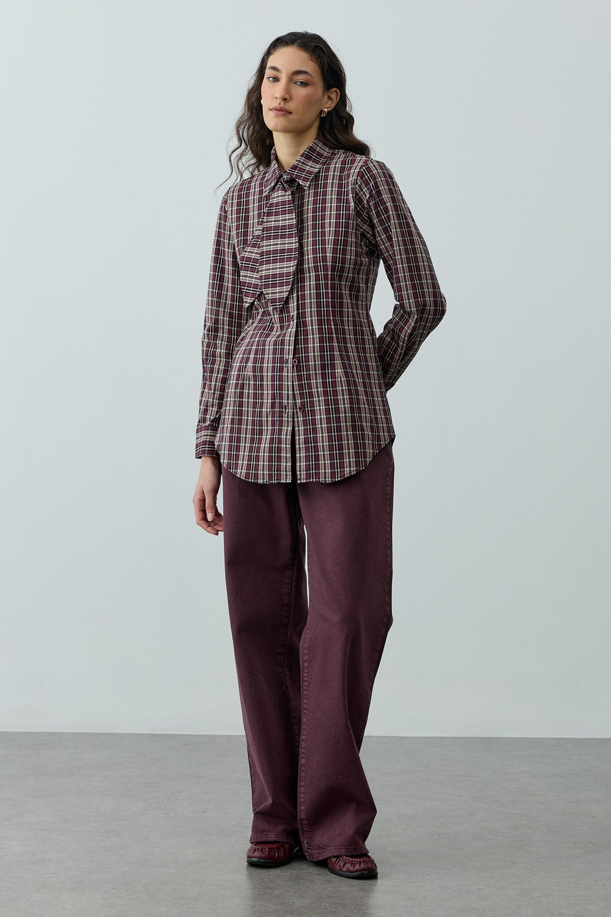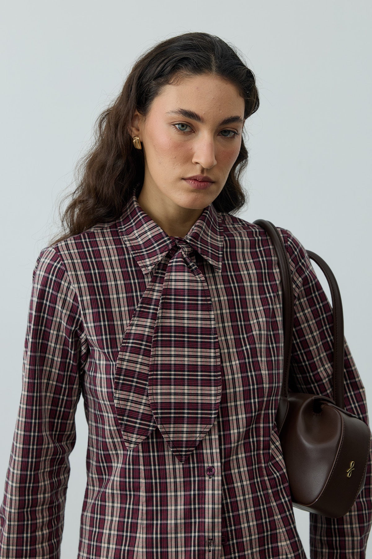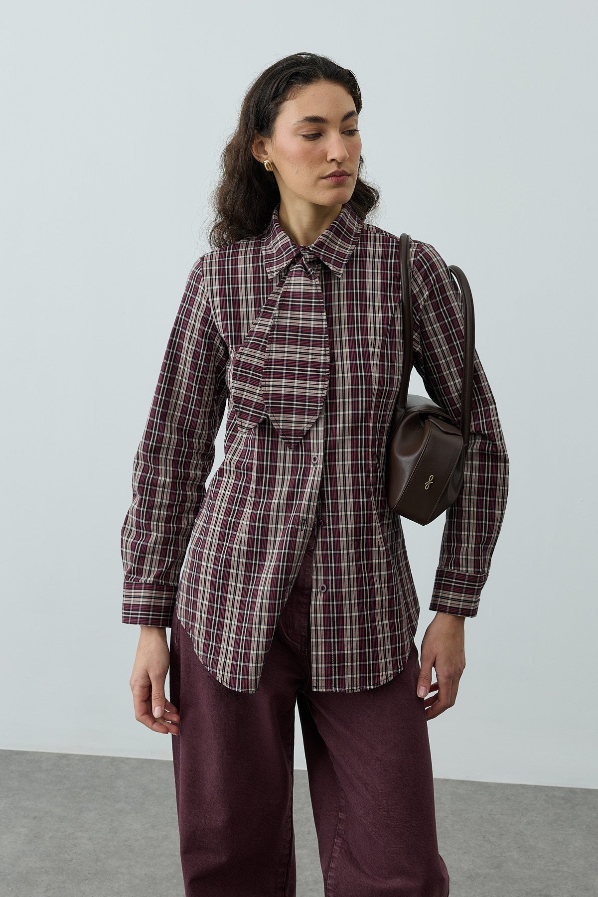 قميص بأكمام طويلة مصنوع من قماش منسوج بمربعات، يتميز بياقة قميص كلاسيكية، إغلاق بأزرار أمامية، أكمام مكففة، وتفاصيل مدببة، مع وشاح قابل للفصل.