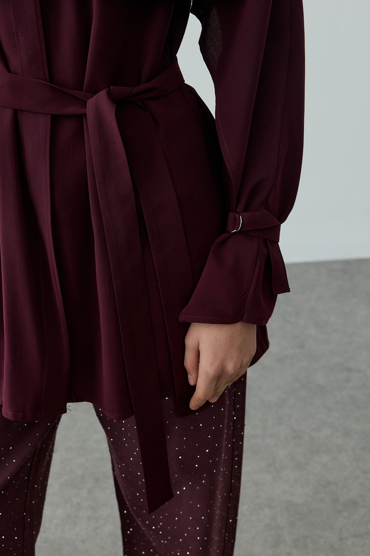 قميص بأكمام طويلة مصنوع من نسيج منسوج ذو ملمس ناعم، يتميز بطوق القميص الكلاسيكي، وتفاصيل الكاب، وأبازيم معدنية على الأكمام، ولوحة أمامية، وإغلاق بالأزرار.