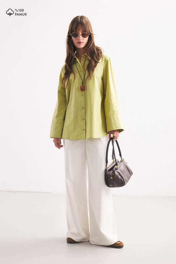 قميص ذو ياقة، بأزرار، وأكمام سميكة، وحزام من نفس القماش، وقص مريح مع أكمام سميكة.