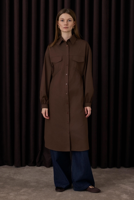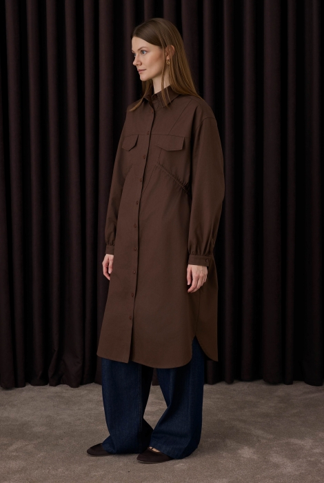 قميص طويل بتفاصيل تجميع بلون القهوة المر