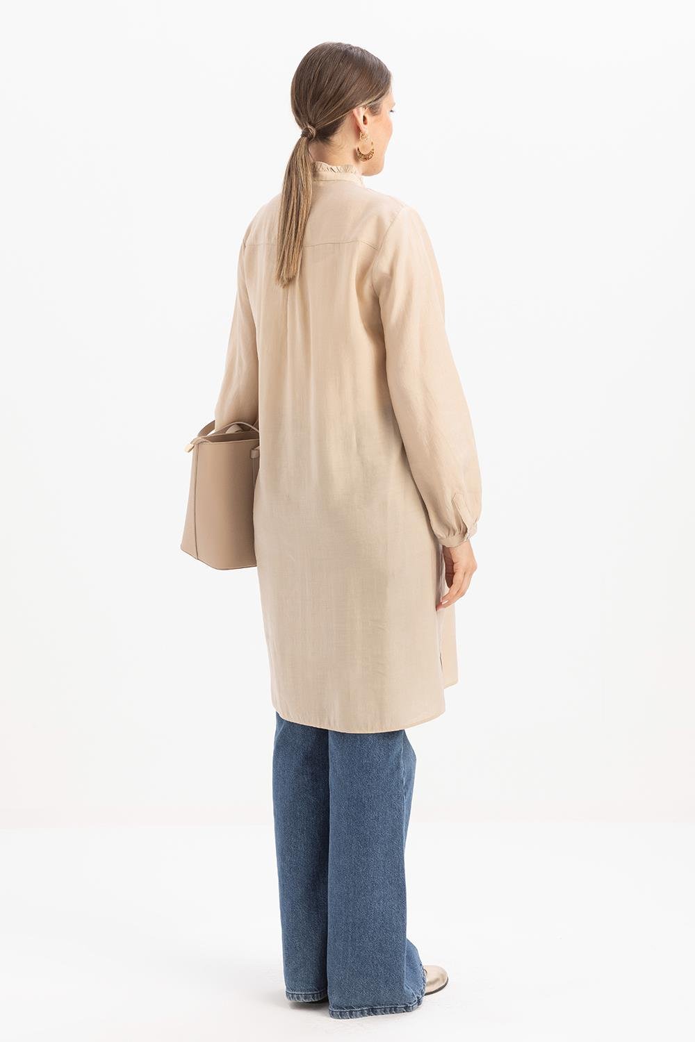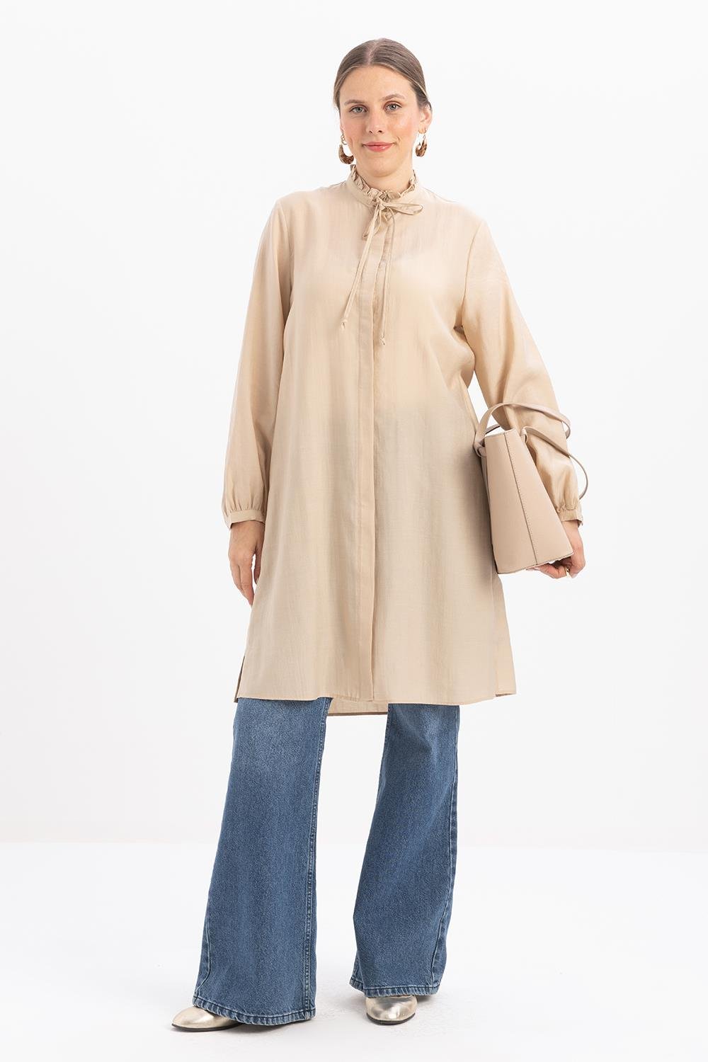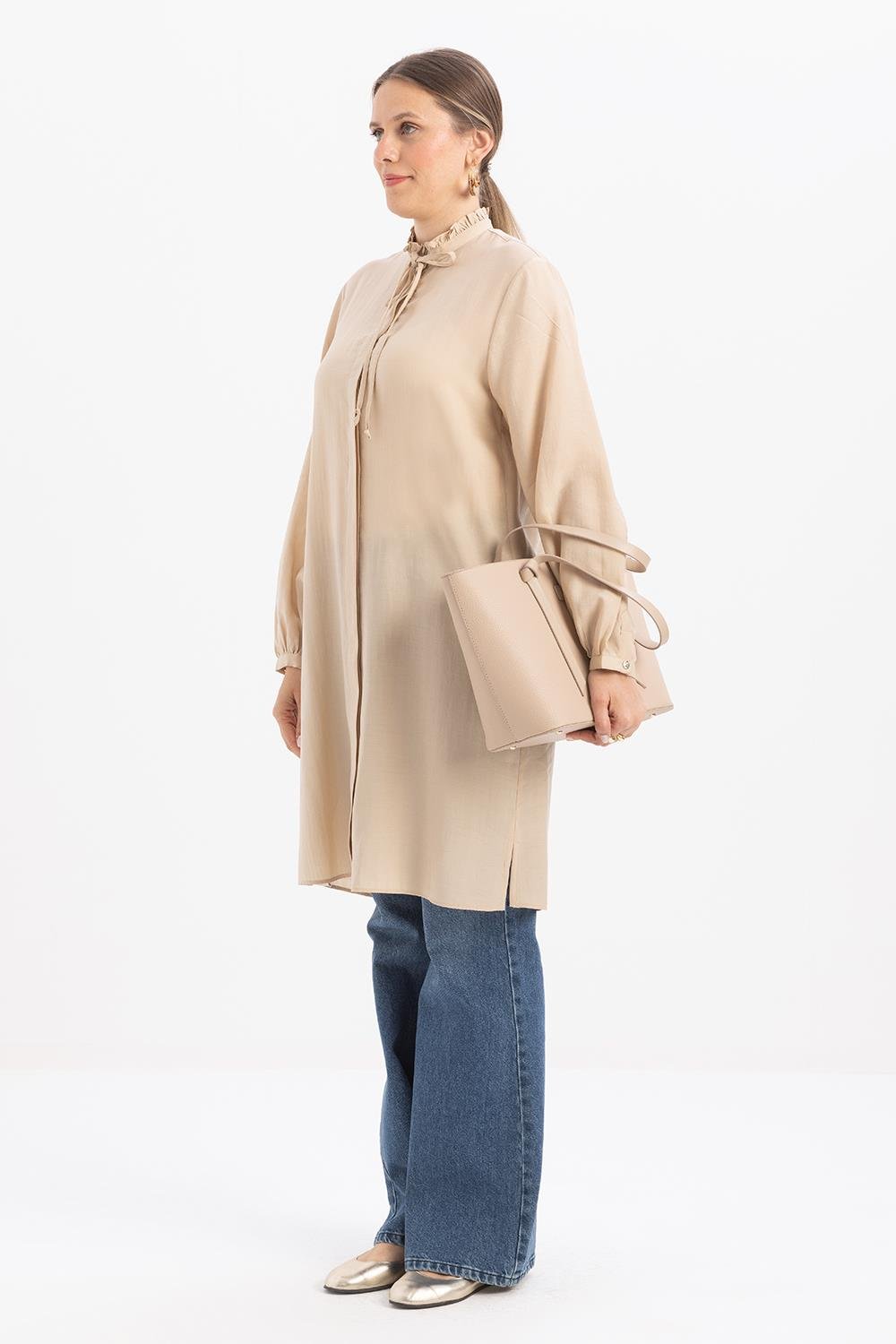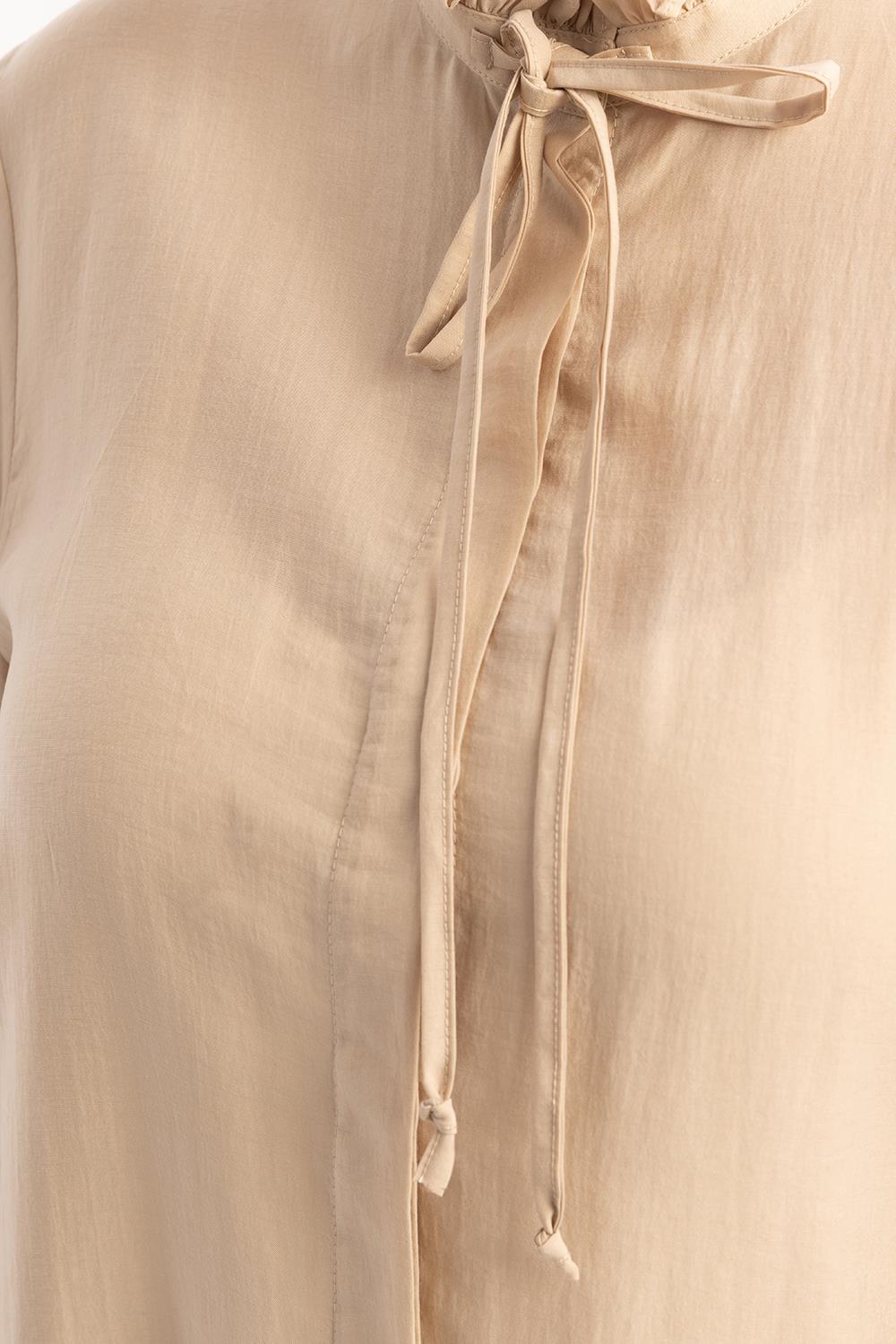 قميص طويل بيج بياقة مكشكشة ورباط