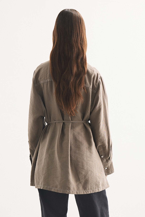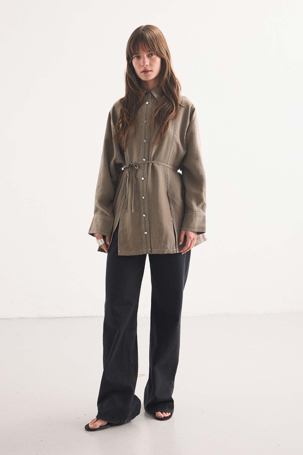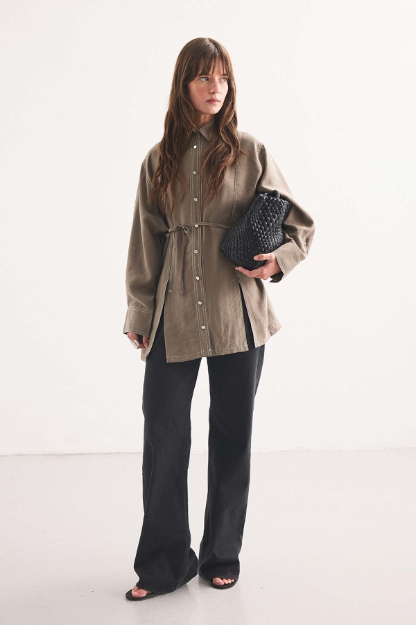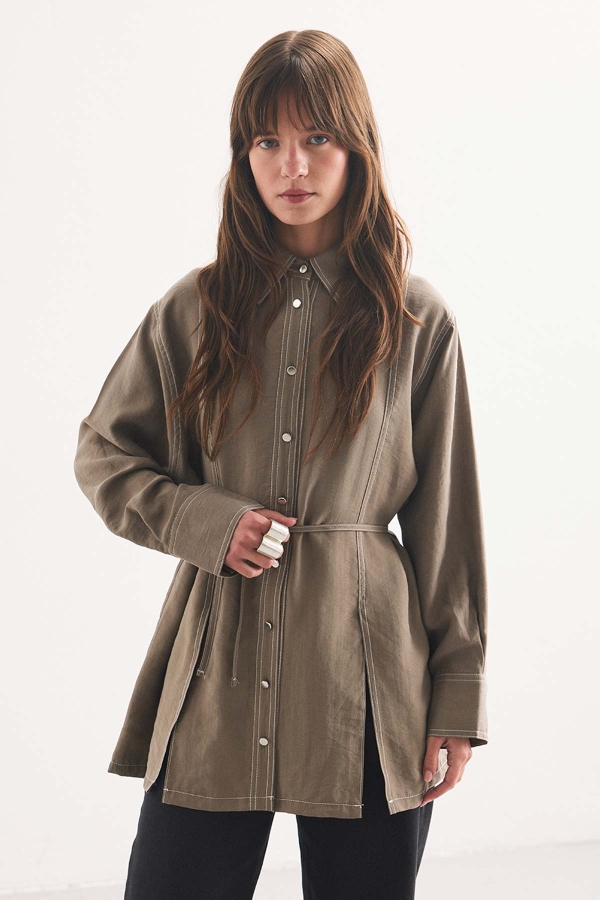 قميص ذو ياقة مع تفاصيل شق عميق من الأمام، خياطة فرنسية، حزام قابل للتعديل من نفس القماش، قطع مريح.