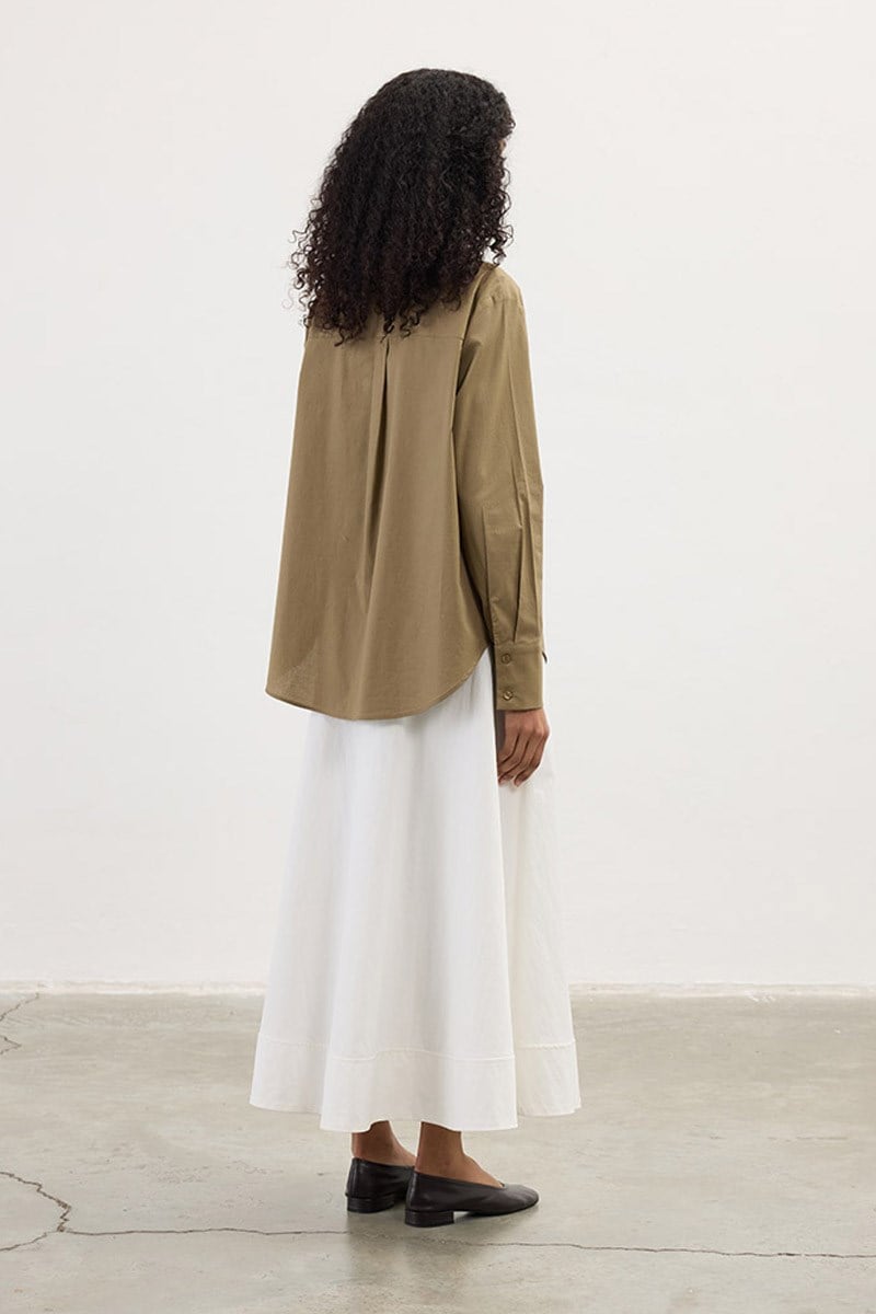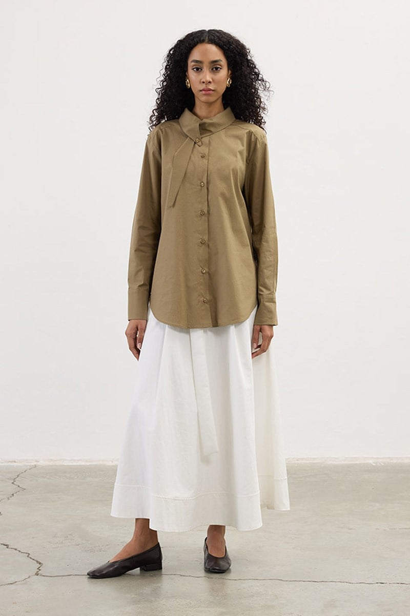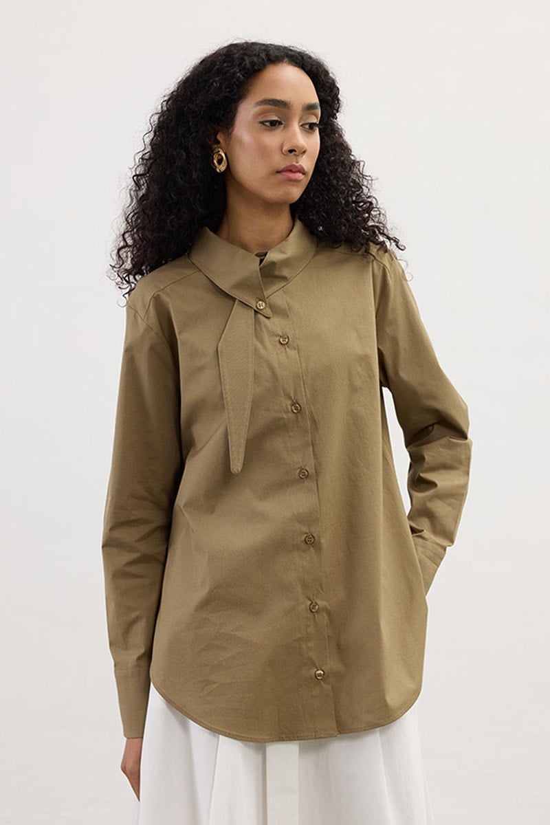 قميص قطني باللون الخاكي بتفاصيل في الياقة