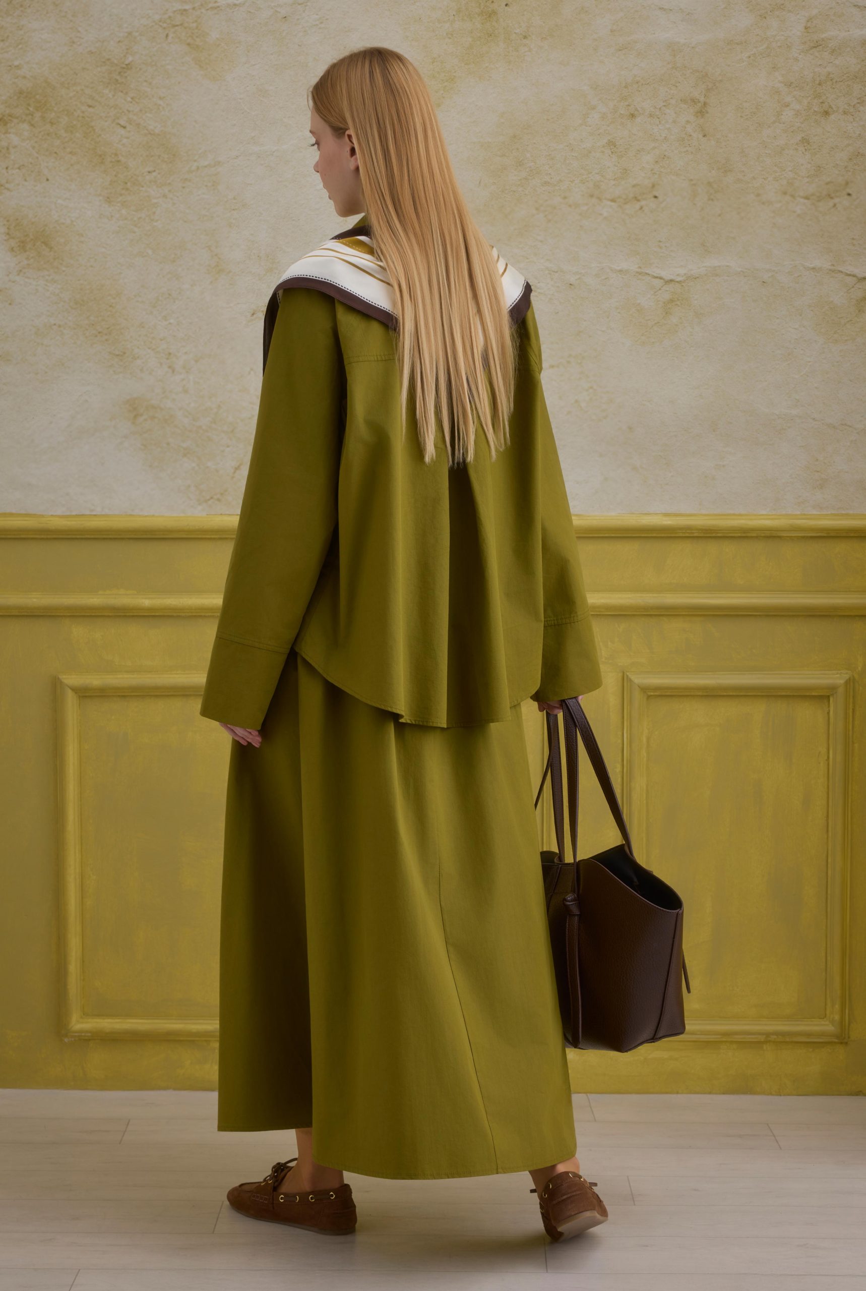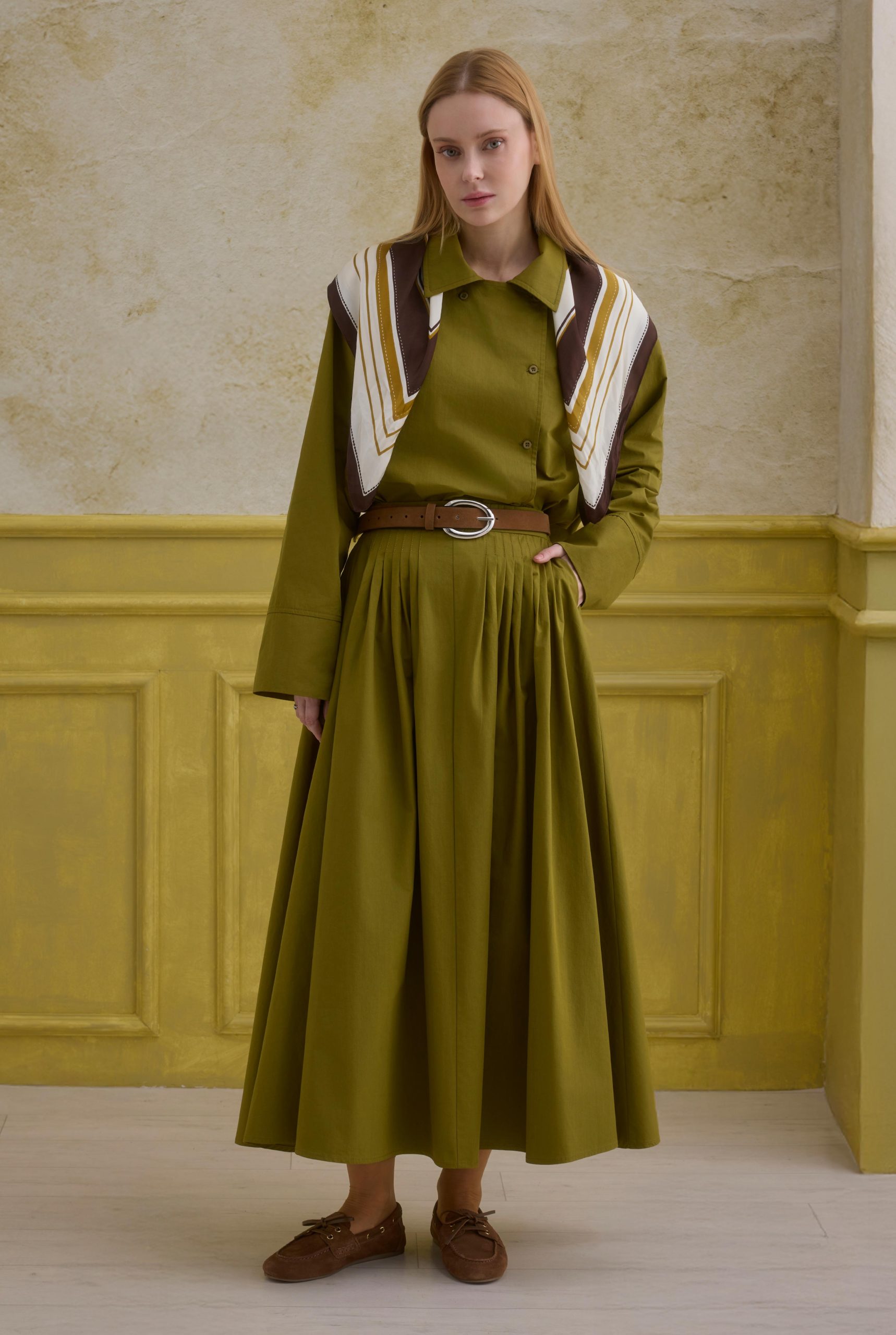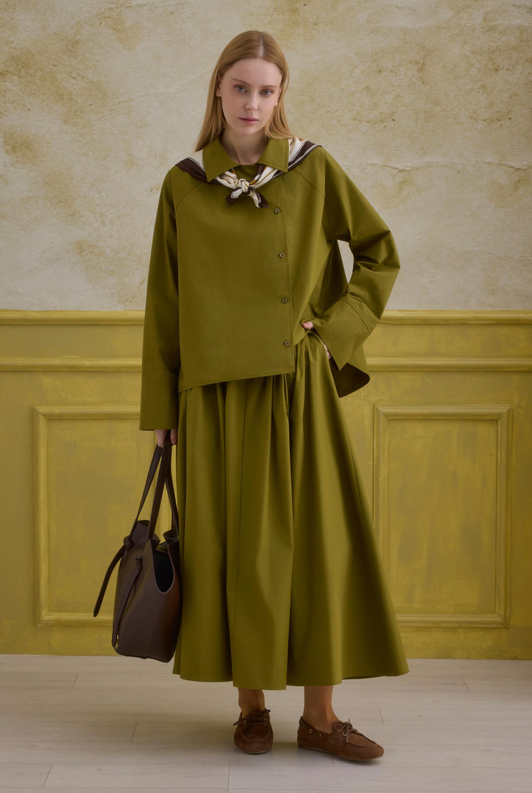 قميص قطني مزدوج الصدر باللون الأخضر الزيتي