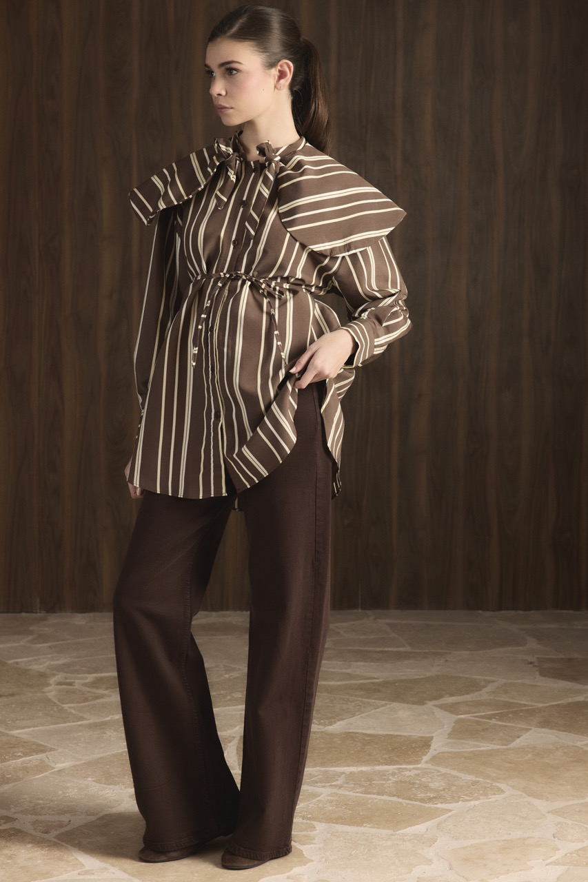ارتقِ بأناقتك مع هذا القميص المخطط بعرض واسع والأنيق بتدرجات البني الغنية. مصنوع من مواد عالية الجودة لراحة استثنائية ومتانة فائقة، هذه القطعة المتعددة الاستخدامات مثالية للمناسبات العادية وشبه الرسمية. النمط المخطط الكلاسيكي وتصميم الياقة العريضة المعاصر يخلقان مظهرًا خالدًا يتناسب مع أي خزانة ملابس.