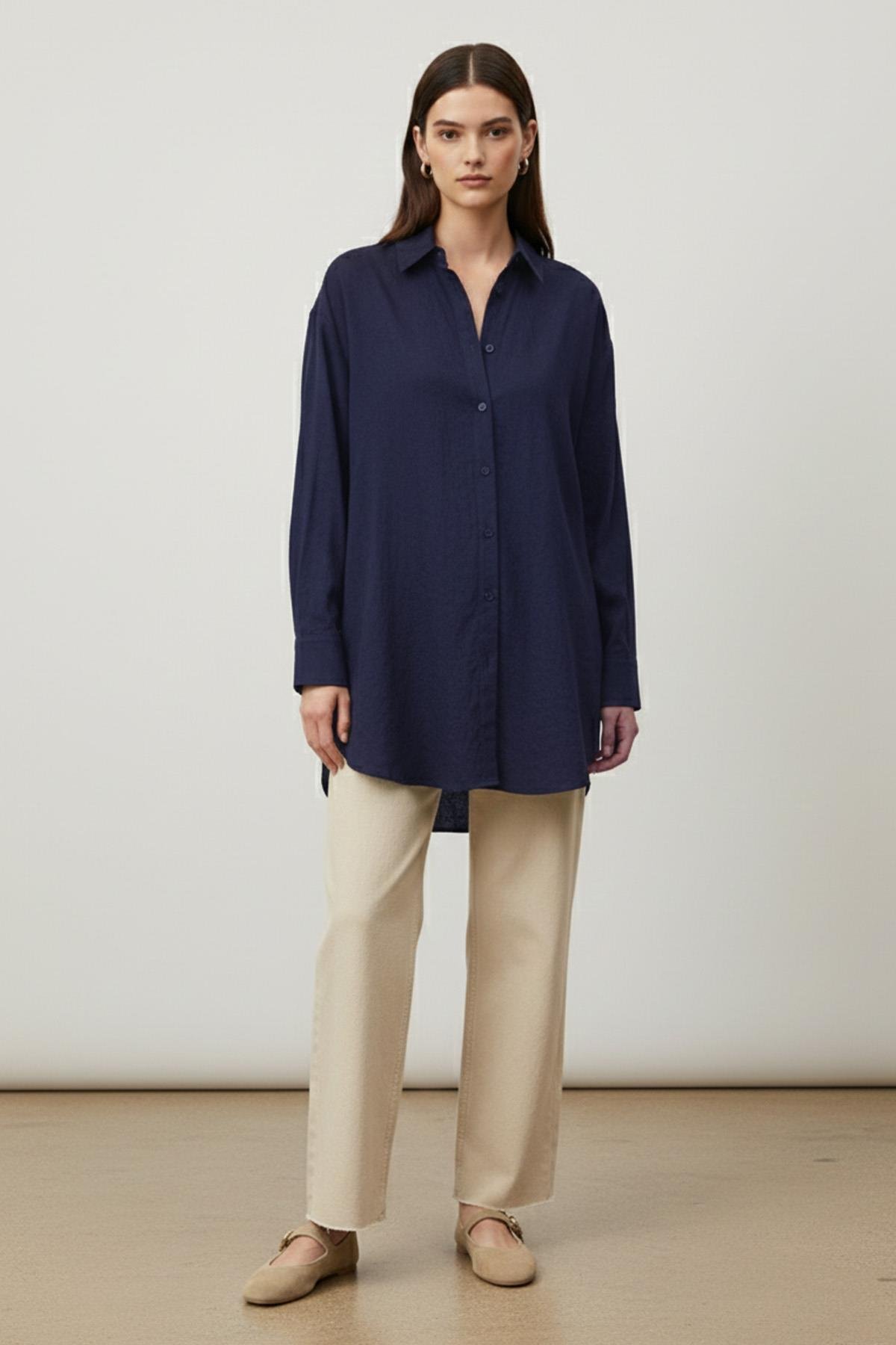 قميص نسائي واسع بأكمام طويلة وأزرار – 10744GML – أزرق بحري