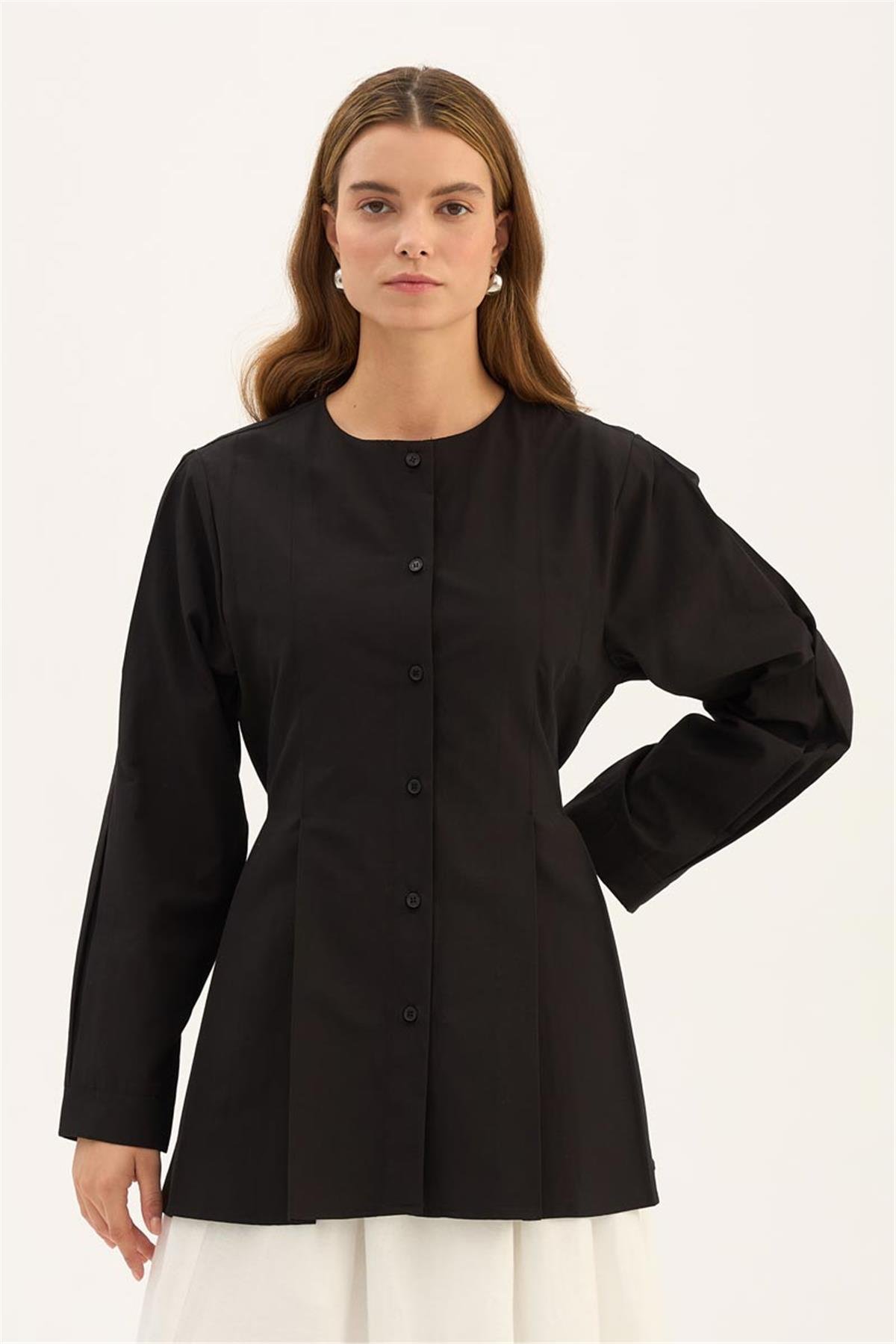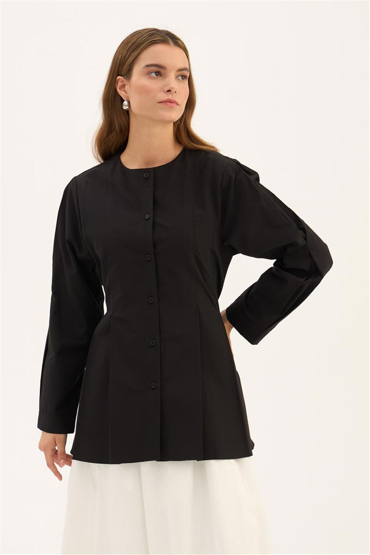 يتميز قميص ياقة الدراجة الأسود بتصميمه الخفيف والأنيق المناسب لموسم الصيف. مصنوع من مزيج 52% قطن و48% بوليستر، مما يمنحه بنية تسمح بالتنفس مع الحفاظ على الشكل. يتميز بتفاصيل ياقة الدراجة، وتصميم الأزرار الأمامية، والأكمام الطويلة، مما يمنحه مظهراً بسيطاً وعصرياً. مناسب لجميع المناسبات، من الملابس اليومية إلى الأناقة المكتبية. اللون الأسود يتناغم بسهولة مع الألوان المحايدة، مما يوفر خيارات أسلوب متعددة.