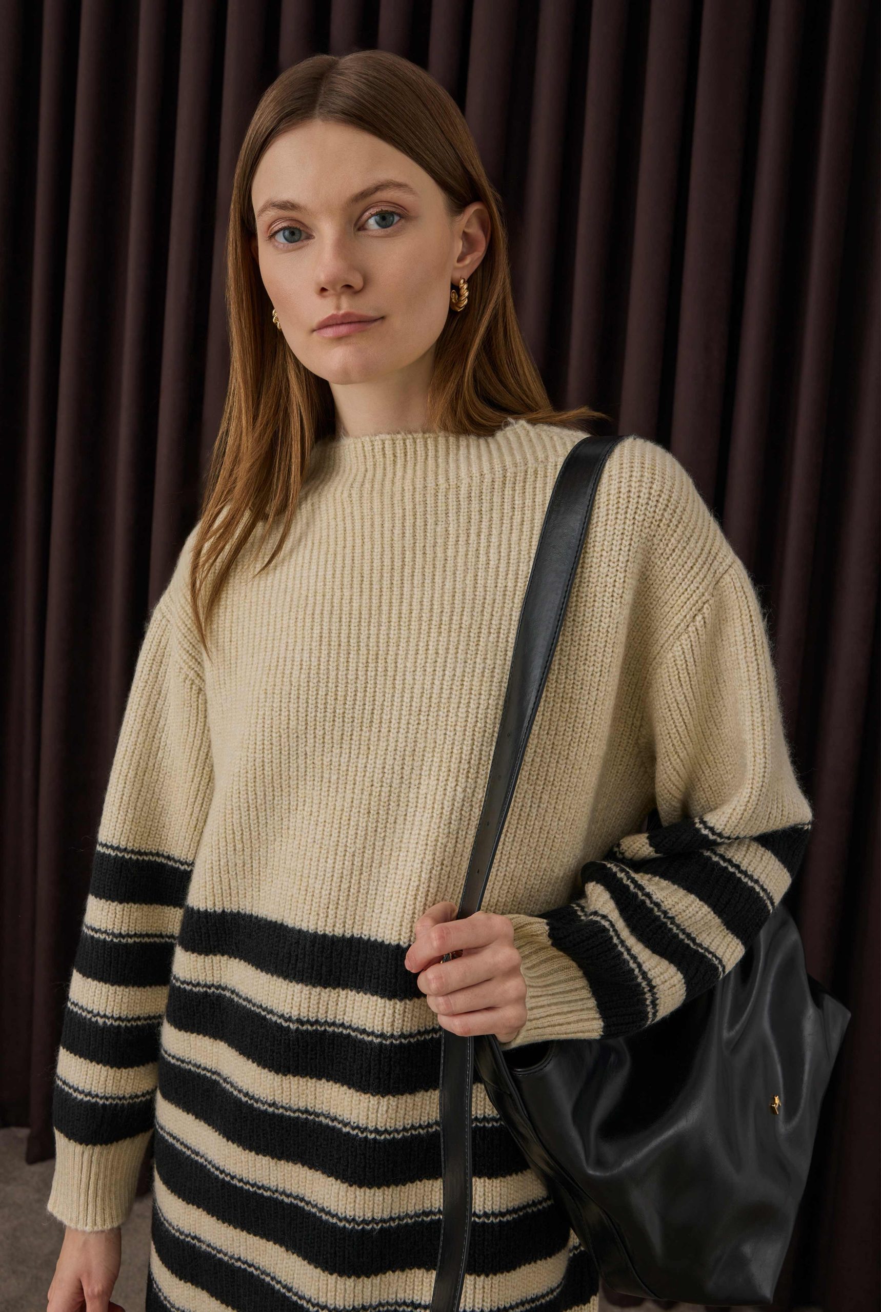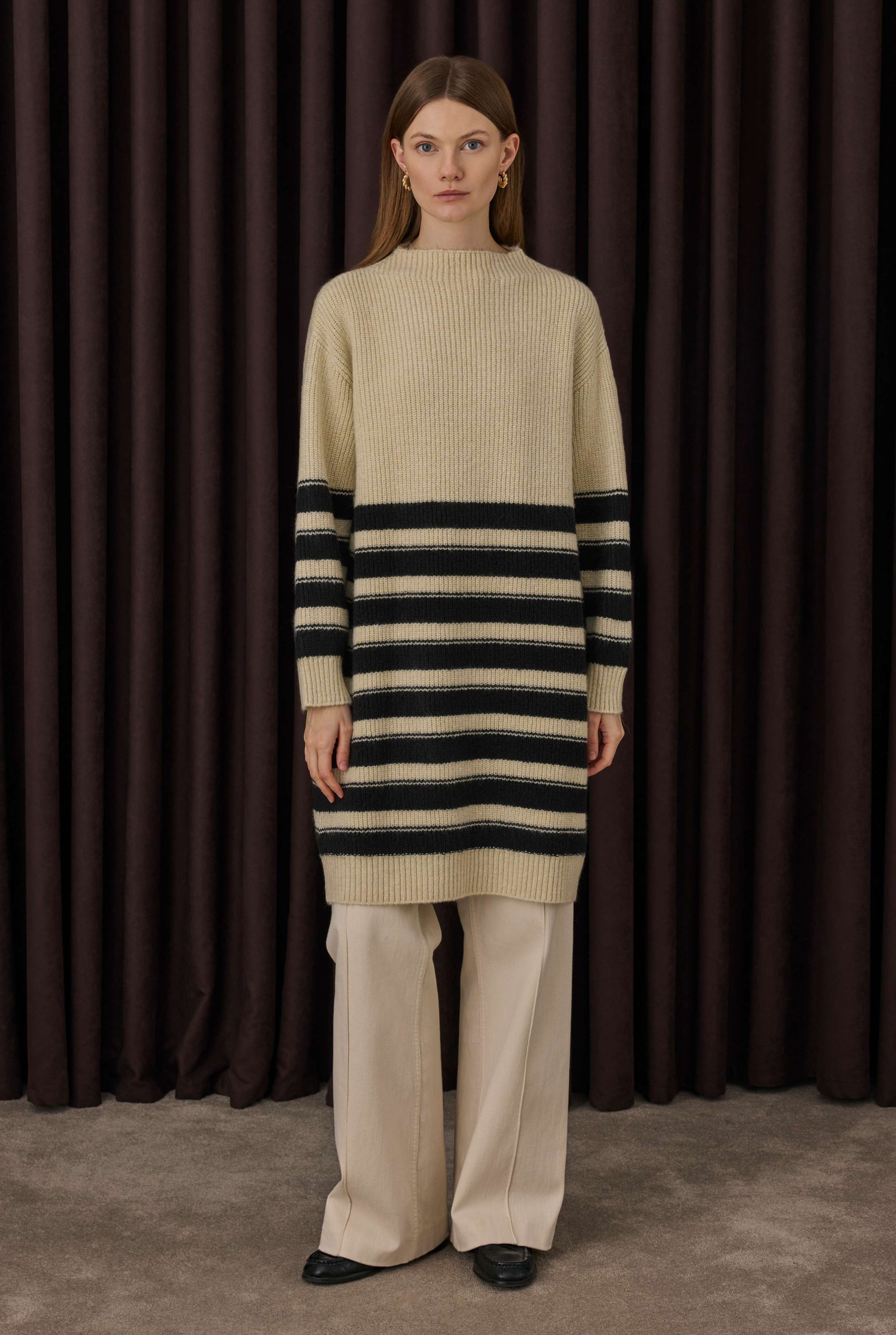 بخطوطها العصرية، تجمع الكنزة الطويلة المخططة بين الراحة والأناقة من خلال تفاصيل الياقة المضلعة. الشكل الطويل يتيح مظهراً مريحاً وأنيقاً.