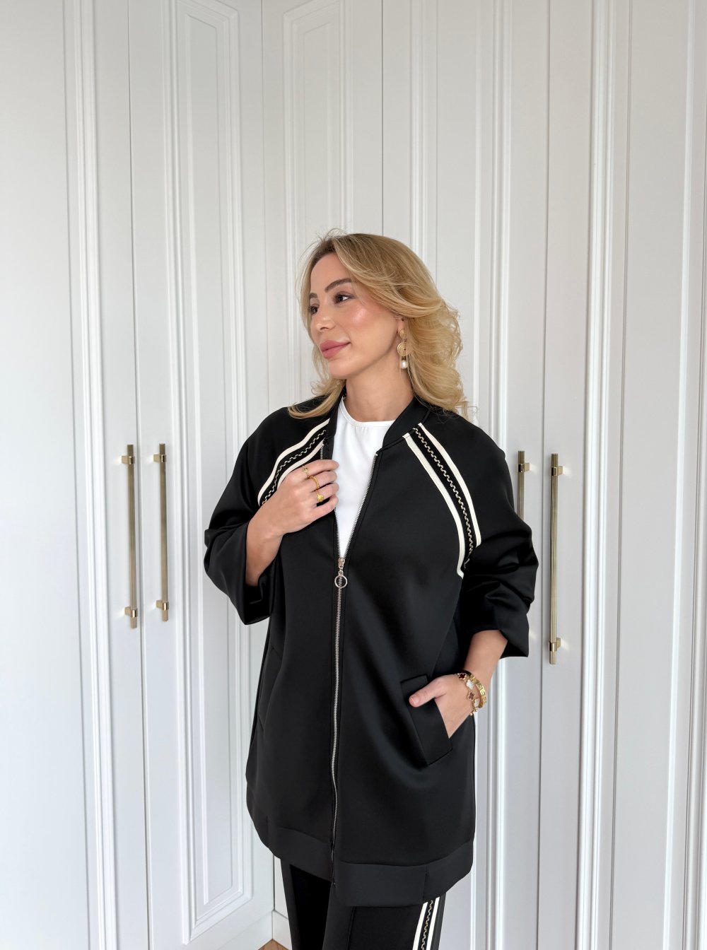 طقم السترة المزدوج هذا بتفاصيله الأنيقة هو خيار متعدد الاستخدامات يمكن استخدامه في العديد من المناسبات، من الدعوات الخاصة إلى الأناقة اليومية. إنه الخيار المثالي للسيدات اللواتي يرغبن في الظهور بأناقة مع الشعور بالراحة. باهتمامه الدقيق بالتفاصيل ووقفته الراقية، يصبح الخيار الأمثل لمن يرغبن في الظهور بأناقة في كل مكان. هذا الطقم مع السترة، الذي يمكن الانتقال به بسهولة من النهار إلى الليل، يصبح قطعة المنقذ في خزانة ملابسك.