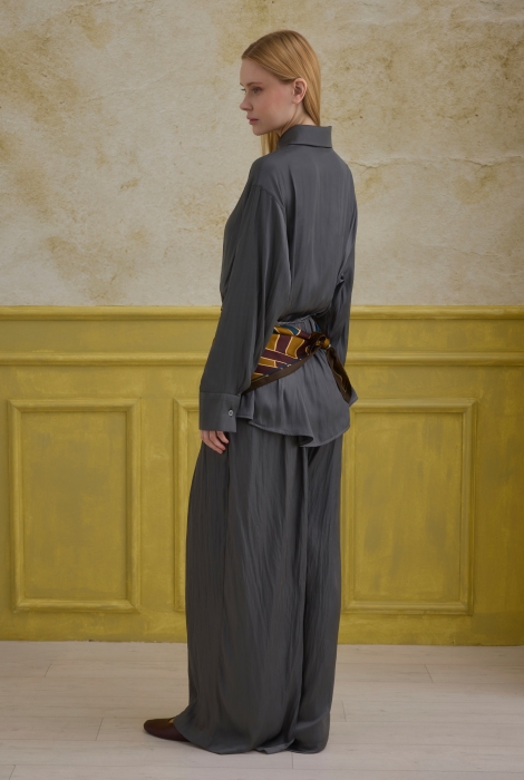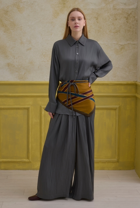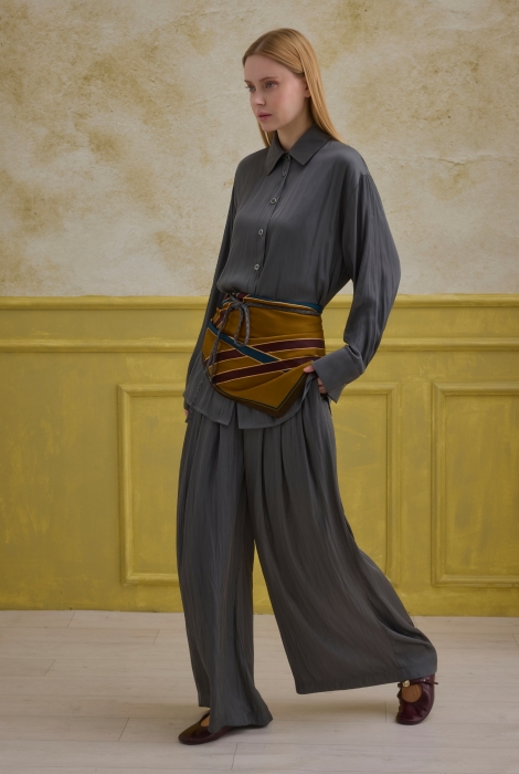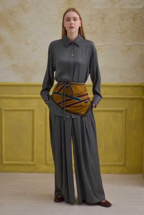 تضيف تفصيلة الحزام المنسوج نسيجًا متناقضًا وإحساسًا بالحركة للتصميم، مما يؤكد على الطراز العصري. توفر السراويل الفضفاضة والمريحة كلًا من الراحة ووقفة قوية ولكنها أنيقة.