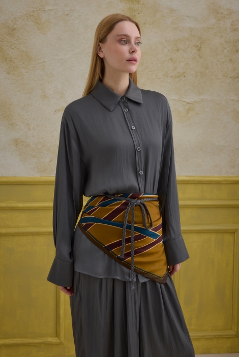 تقدم هذه المجموعة المصنوعة من قماش الساتان بنسبة 100% من البوليستر نسيجًا غنيًا وديناميكيًا على سطحها بفضل تقنية الحياكة المجعدة الخاصة. تمنح البريق الطبيعي والمظهر المتدفق للساتان التصميم توهجًا أنيقًا، بينما يضمن محتوى البوليستر المتانة والاحتفاظ بالشكل والارتداء طويل الأمد. يخلق هيكلها الخفيف والمتدفق ظلًا أنيقًا على الجسم.