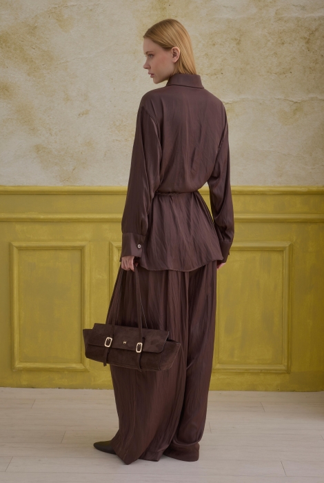 تُقدم هذه المجموعة المصنوعة من قماش الساتان بنسبة 100% بوليستر نسيجاً غنياً وديناميكياً على سطحها بفضل تقنية الحياكة المجعدة الخاصة. تمنح اللمعة الطبيعية والمظهر المتدفق للساتان التصميم بريقاً أنيقاً، بينما يضمن محتوى البوليستر المتانة والاحتفاظ بالشكل والارتداء طويل الأمد. يخلق هيكلها الخفيف والمتدفق ظلاً أنيقاً على الجسم.