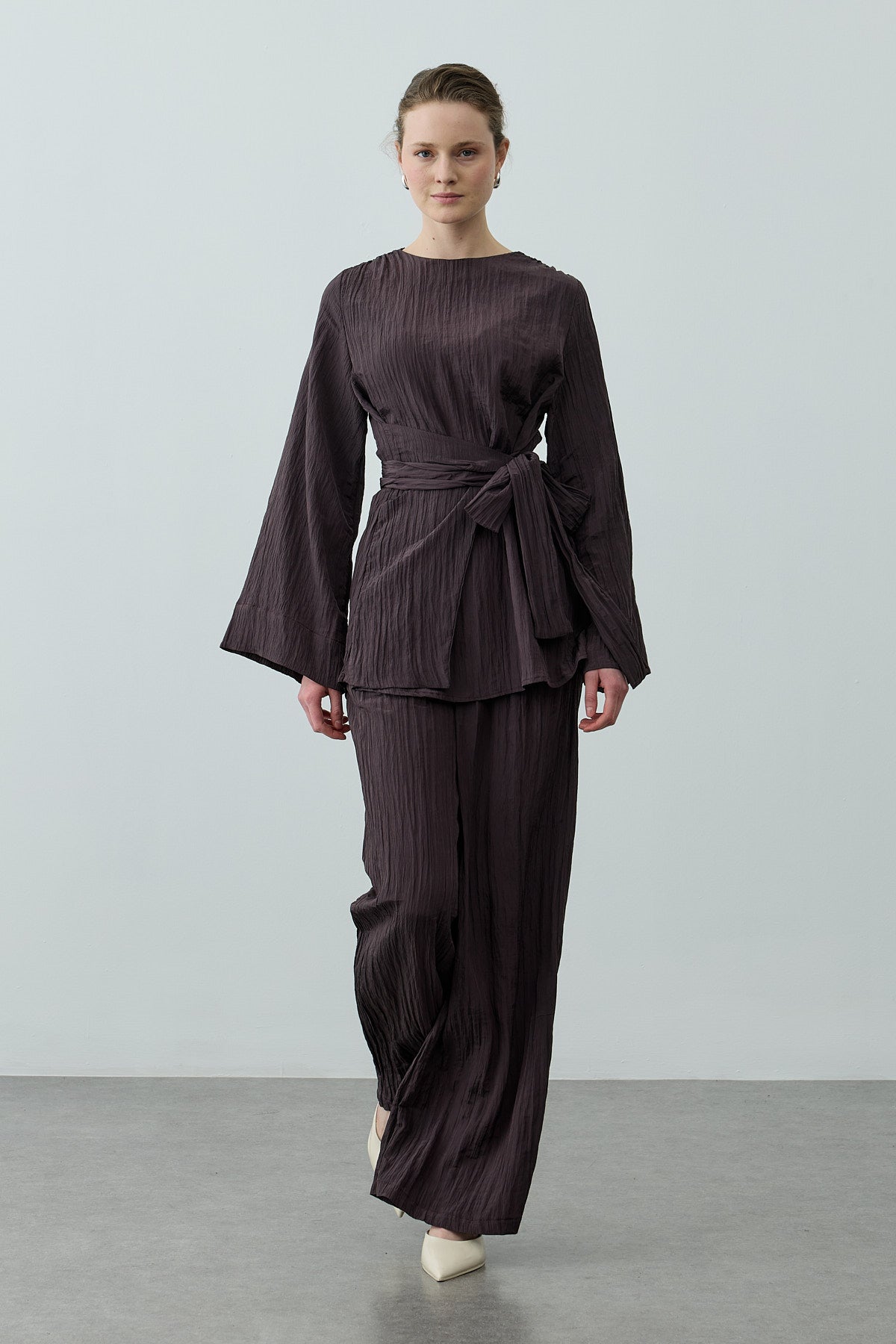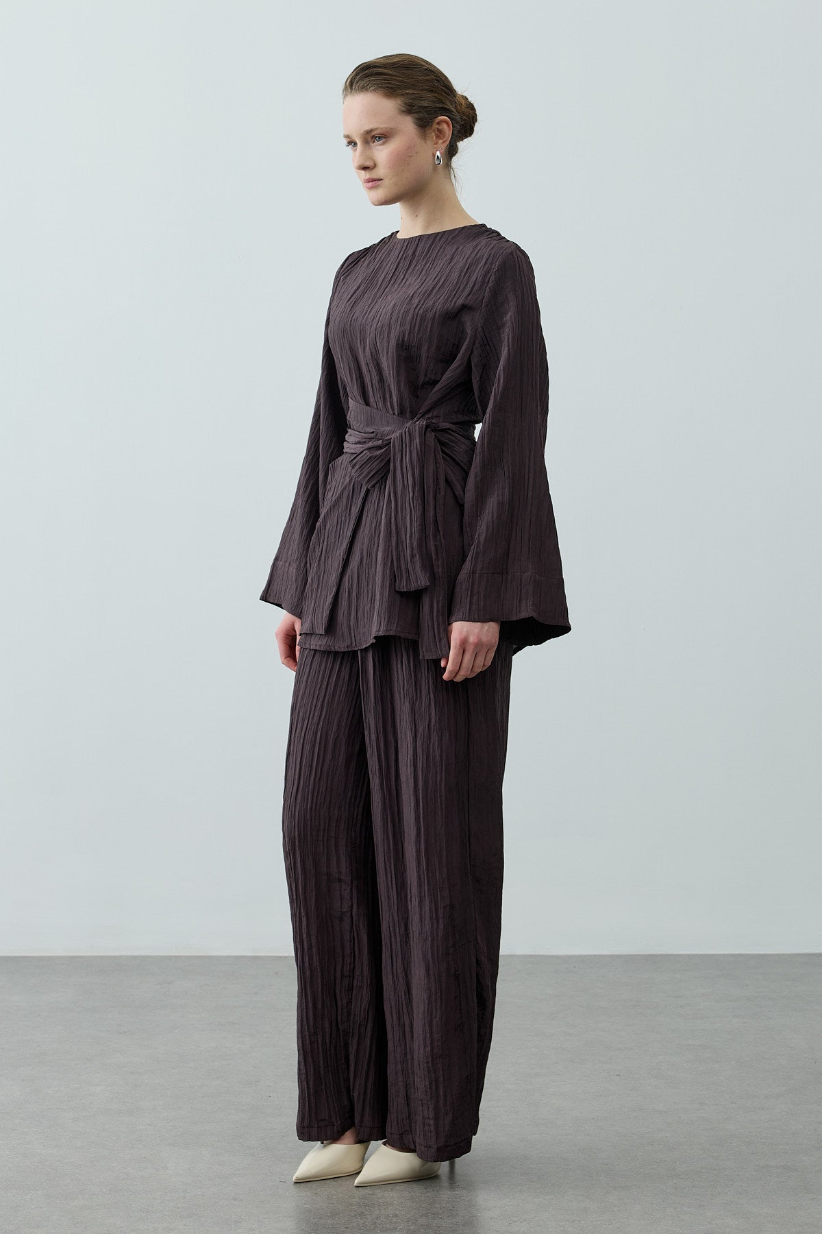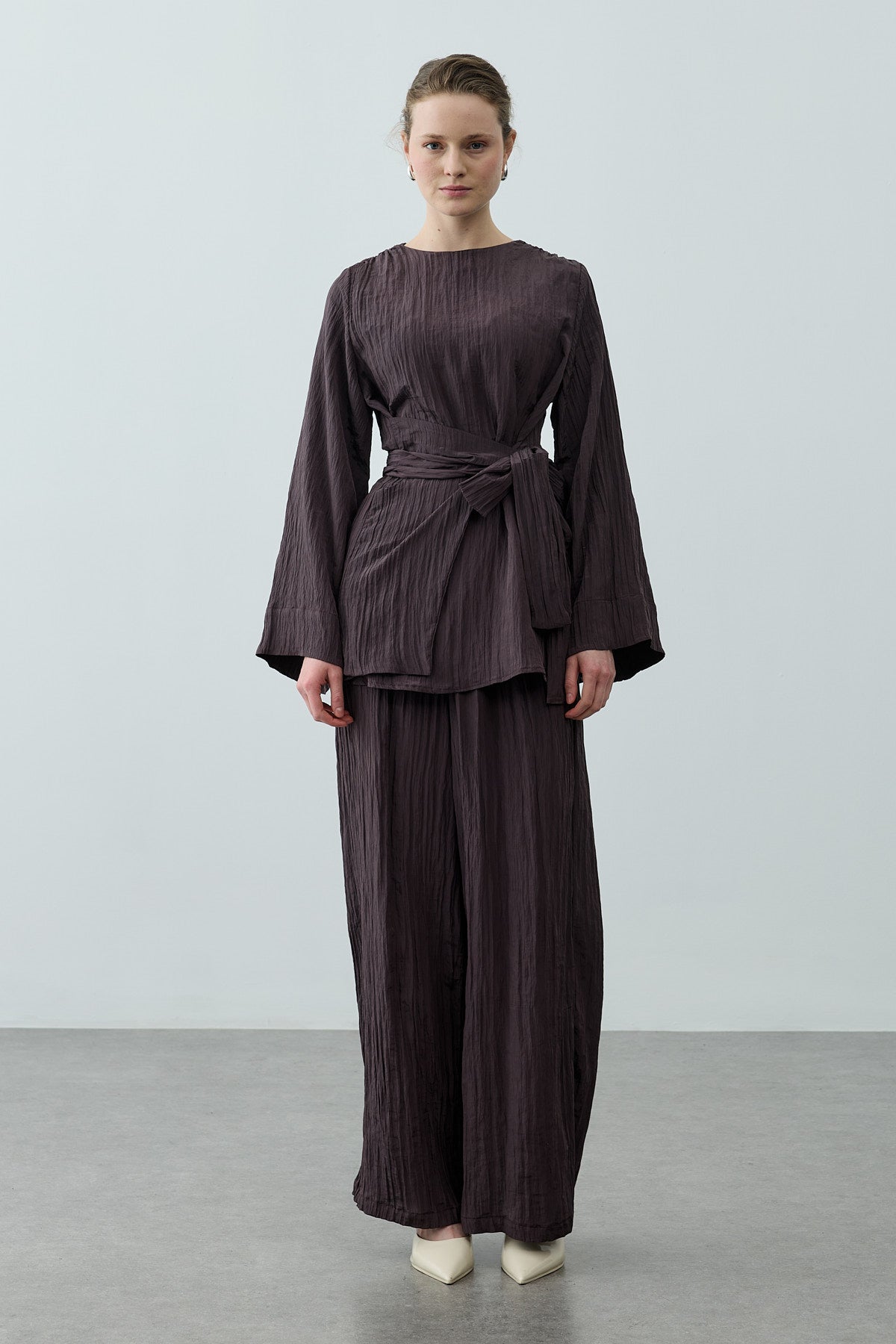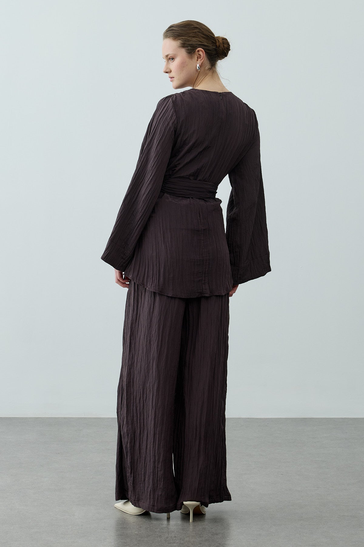 مجموعة أنيقة تتكون من بلوزة قماش مكسر لامع منسوج بتصميم ياقة صينية وإغلاق بسحاب من الخلف وأكمام طويلة وتفاصيل حزام عريض، مع بنطلون بالازو بقصّة واسعة وخصر مطاطي وجيوب.