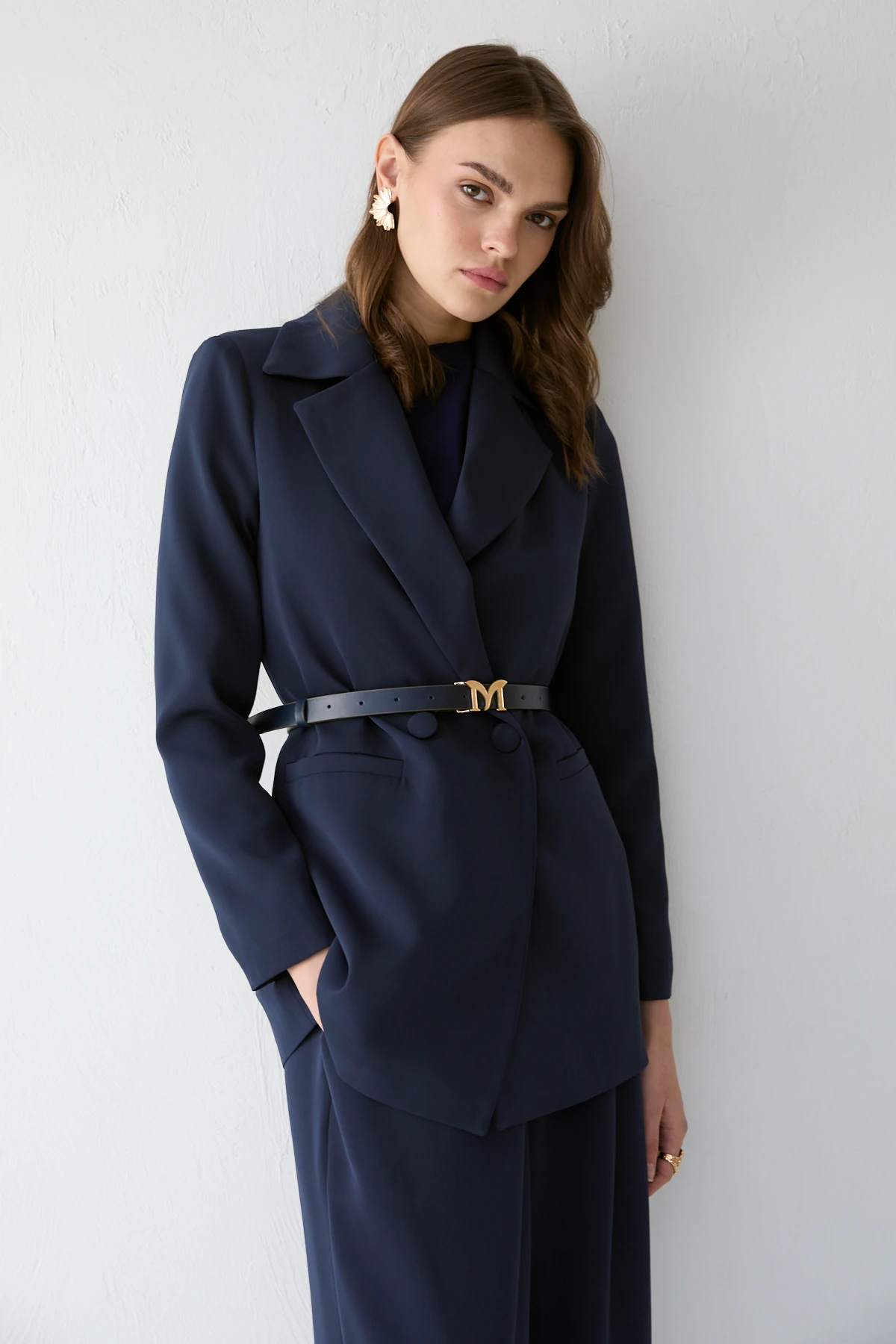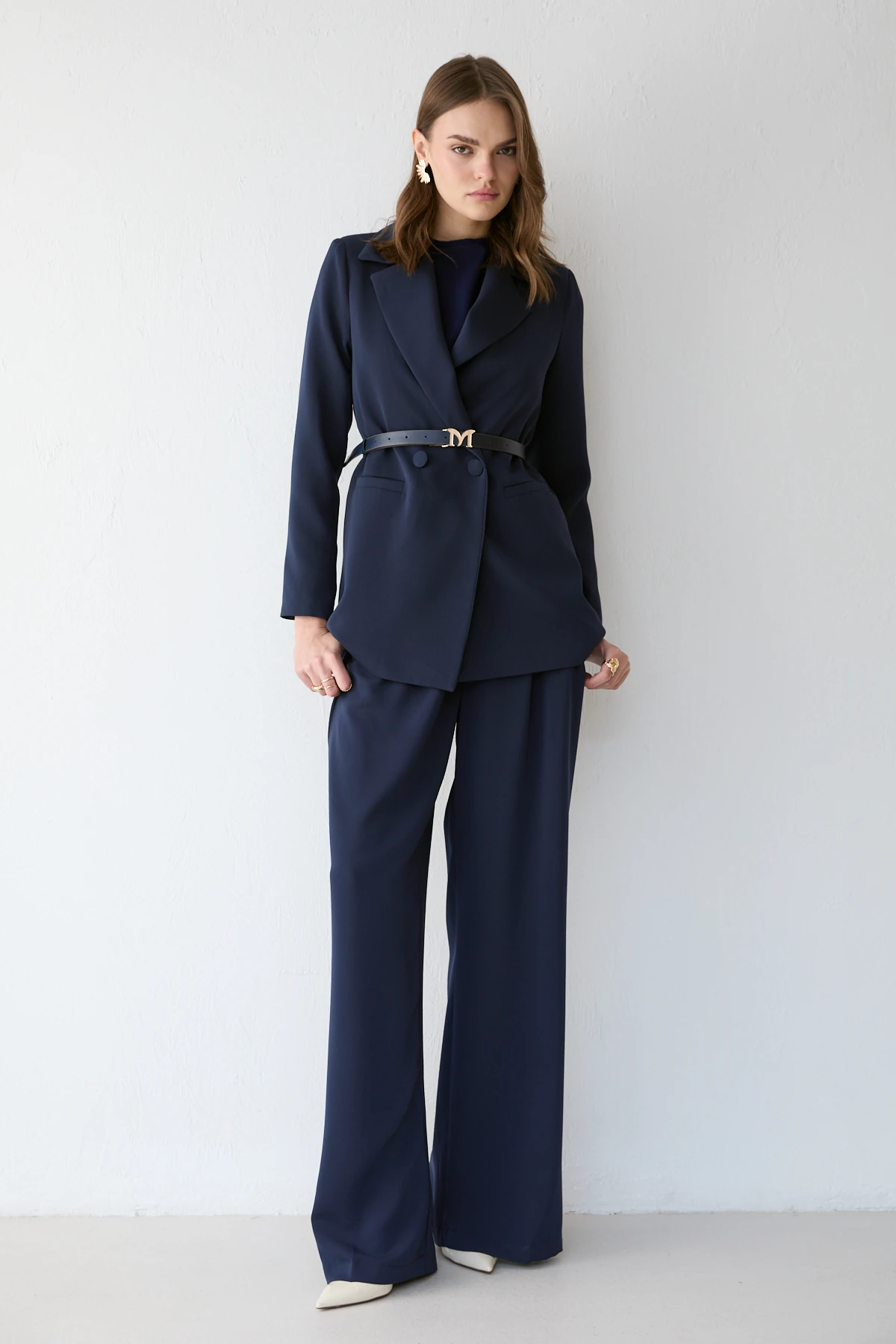 تتميز هذه المجموعة الأنيقة بتصميم أزرار أمامية وأكتاف مبطنة وتفاصيل جيب أمامي لمظهر قوي وأنيق، مكتملة بحزام قابل للإزالة وإكسسوار شال. البلوزة المبطنة والبنطلون بحزام أمامي مستقيم وظهر مطاطي يضمنان الراحة طوال اليوم. قوام قماش كريب أدريانا الرشيق مع تفاصيل شال من الساتان يضيفان أناقة حصرية لهذا الطراز.