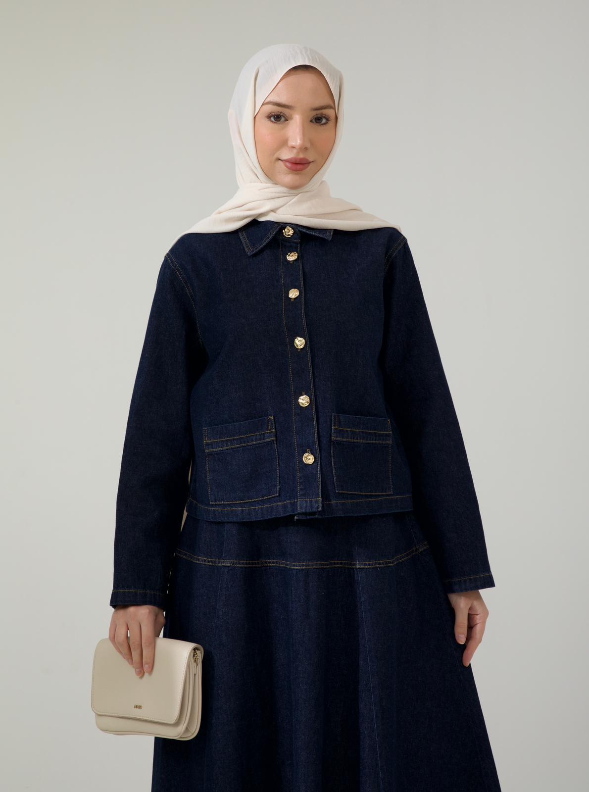 مجموعة جاكيت وتنورة دنيم باللون الأزرق الداكن
