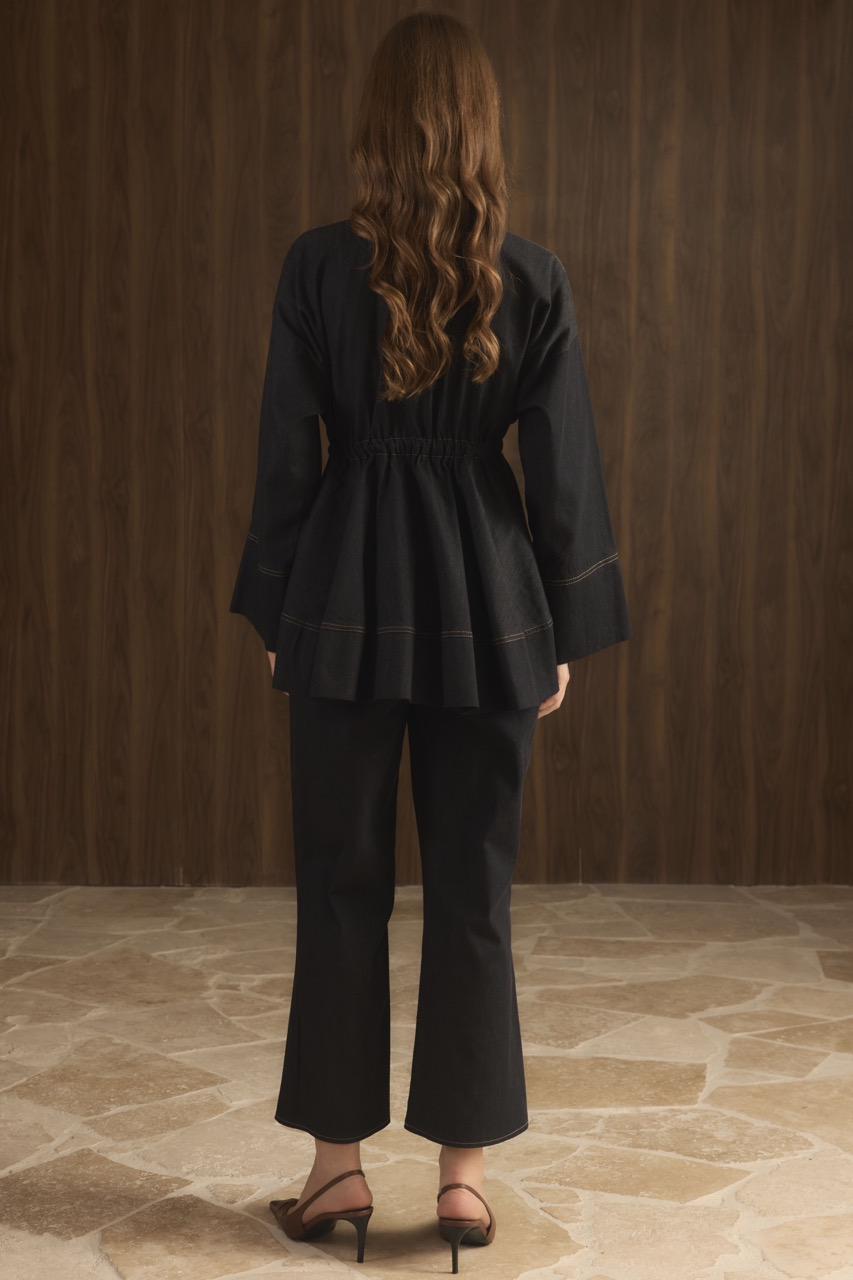 ارتقِ بخزانة ملابسك اليومية مع هذه المجموعة الأنيقة من الدنيم باللون الأزرق البحري. يمنحك التصميم عالي الخصر قواماً متناسقاً وجذاباً، بينما يضمن قماش الدنيم عالي الجودة الراحة والمتانة. مثالية لتشكيل إطلالات عصرية يومية تتنقل بسلاسة من النهار إلى الليل.