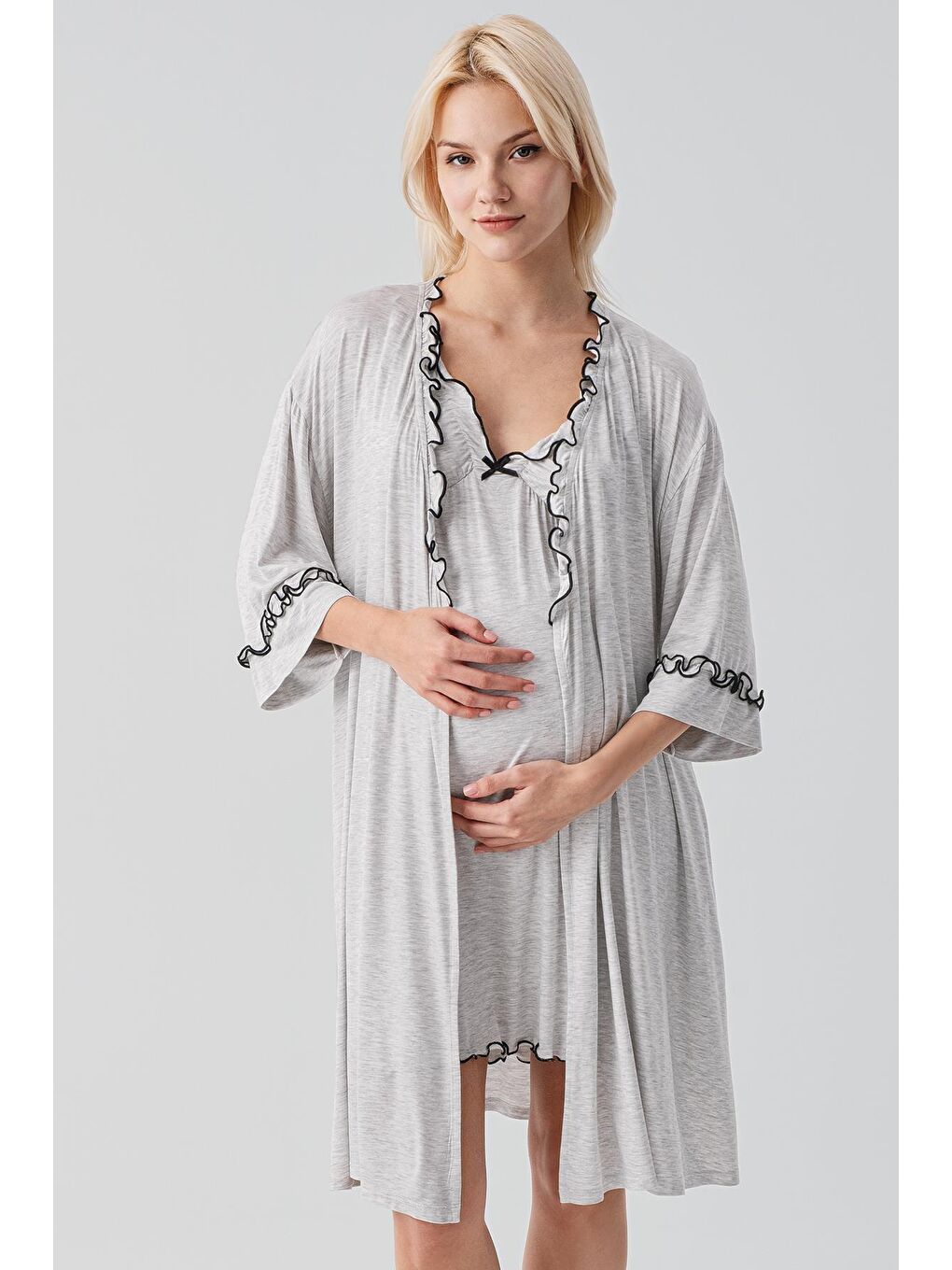 مجموعة رداء الصباح والبيجاما القصيرة الرمادية للحوامل 19400 – مرنة من فيسكوز وإيلاستين الناعم