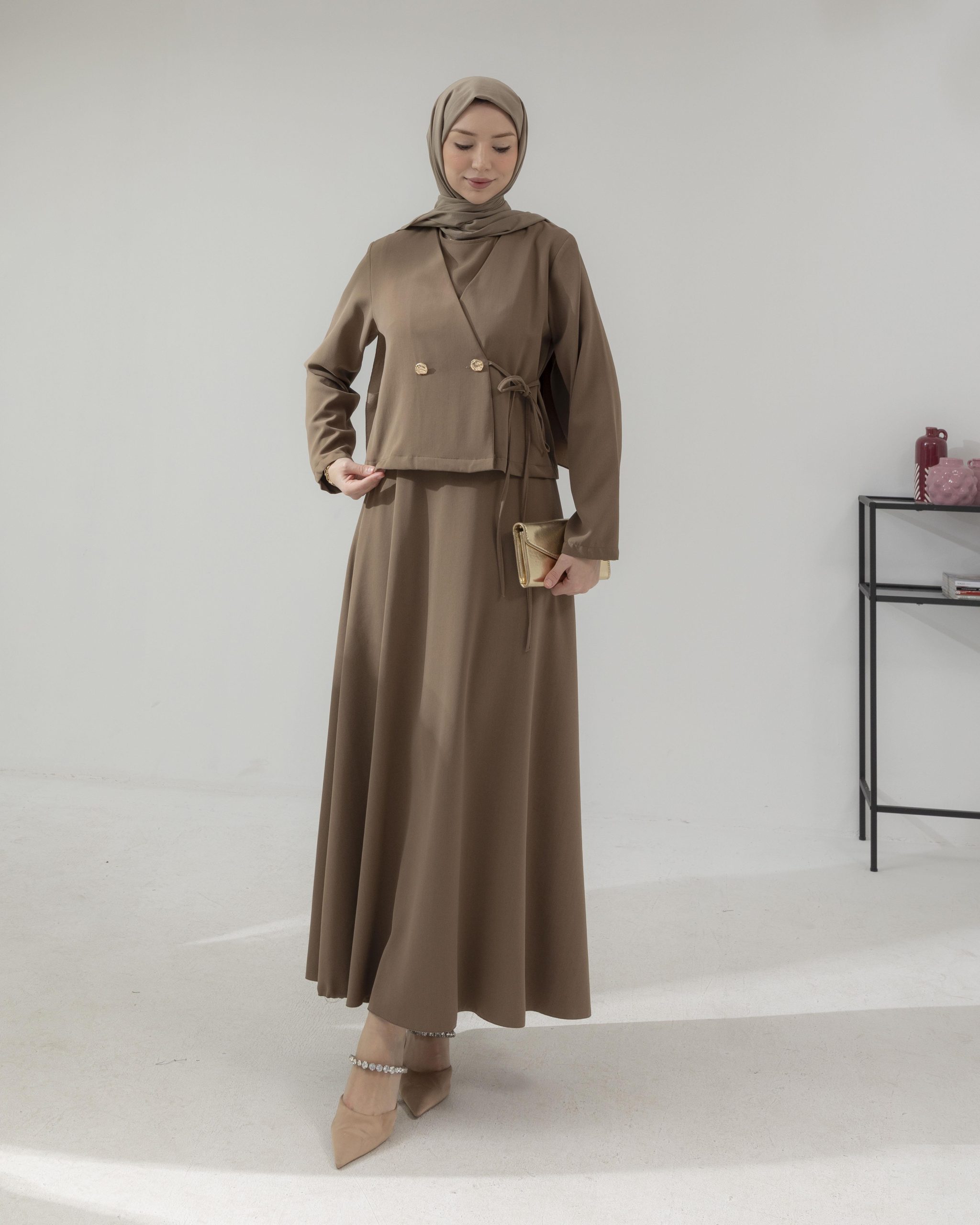طقم السترة المزدوج هذا بتفاصيله الأنيقة هو خيار متعدد الاستخدامات يمكن استخدامه في العديد من المناسبات، من الدعوات الخاصة إلى الأناقة اليومية. إنه الخيار المثالي للسيدات اللواتي يرغبن في الظهور بأناقة مع الشعور بالراحة. باهتمامه الدقيق بالتفاصيل ووقفته الراقية، يصبح الخيار الأمثل لمن يرغبن في الظهور بأناقة في كل مكان. هذا الطقم مع السترة، الذي يمكن الانتقال به بسهولة من النهار إلى الليل، يصبح قطعة المنقذ في خزانة ملابسك.