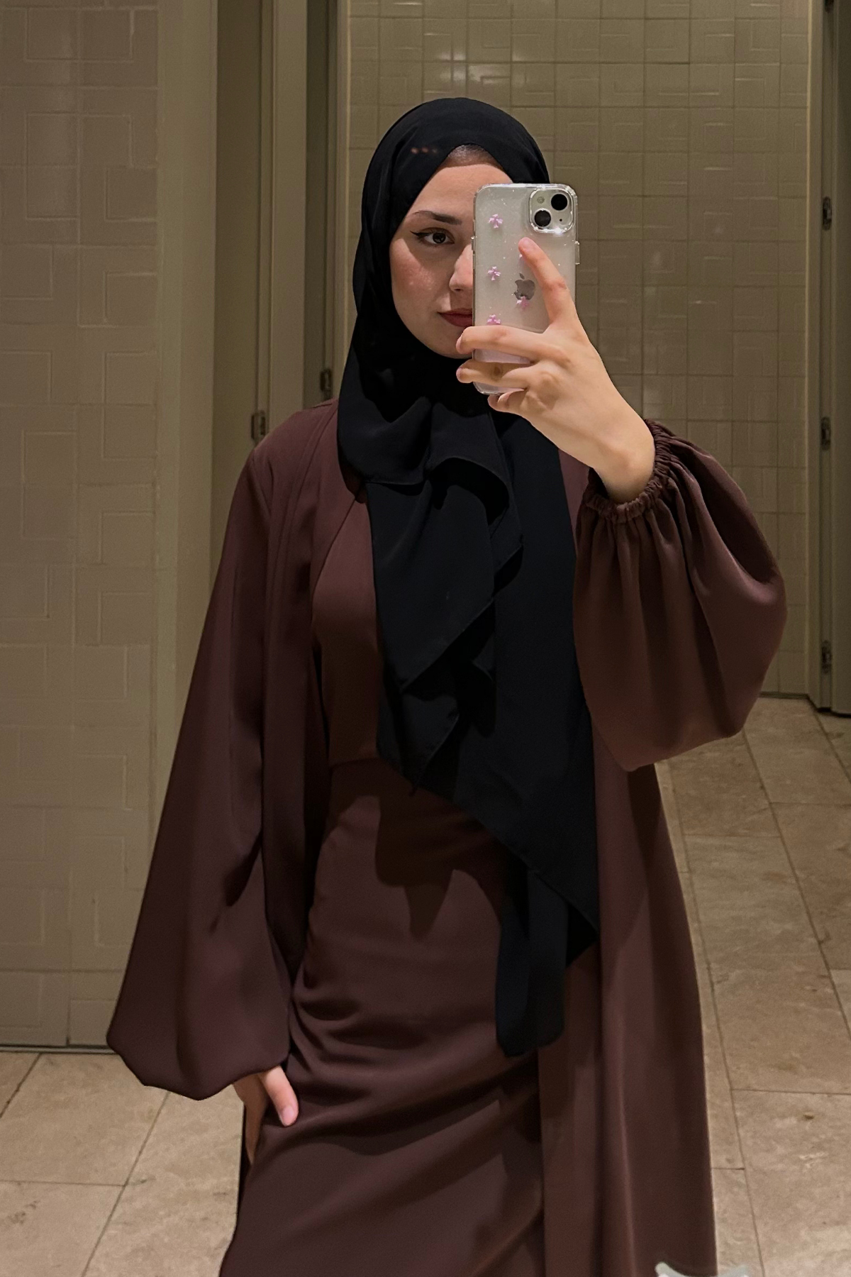 طقم عباءة لؤلؤي باللون العنابي